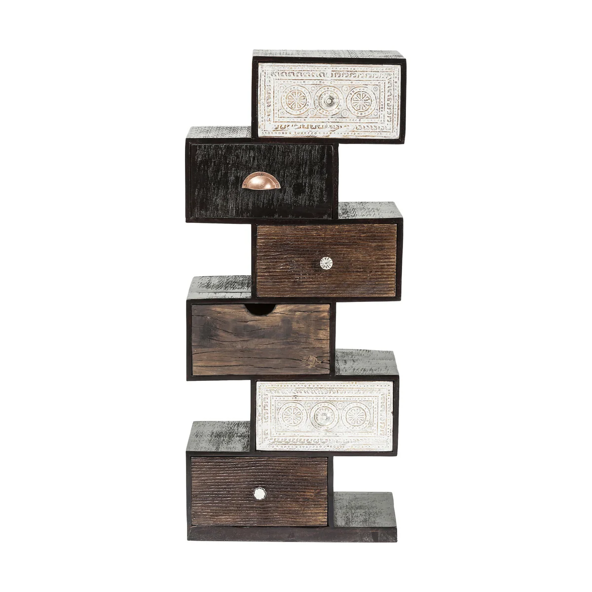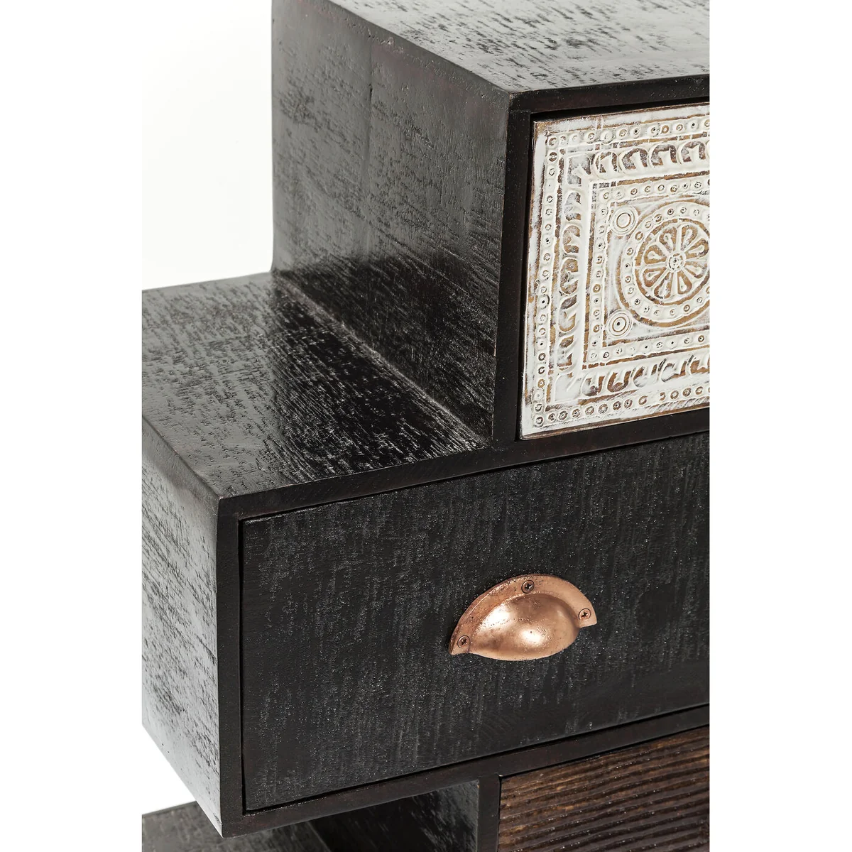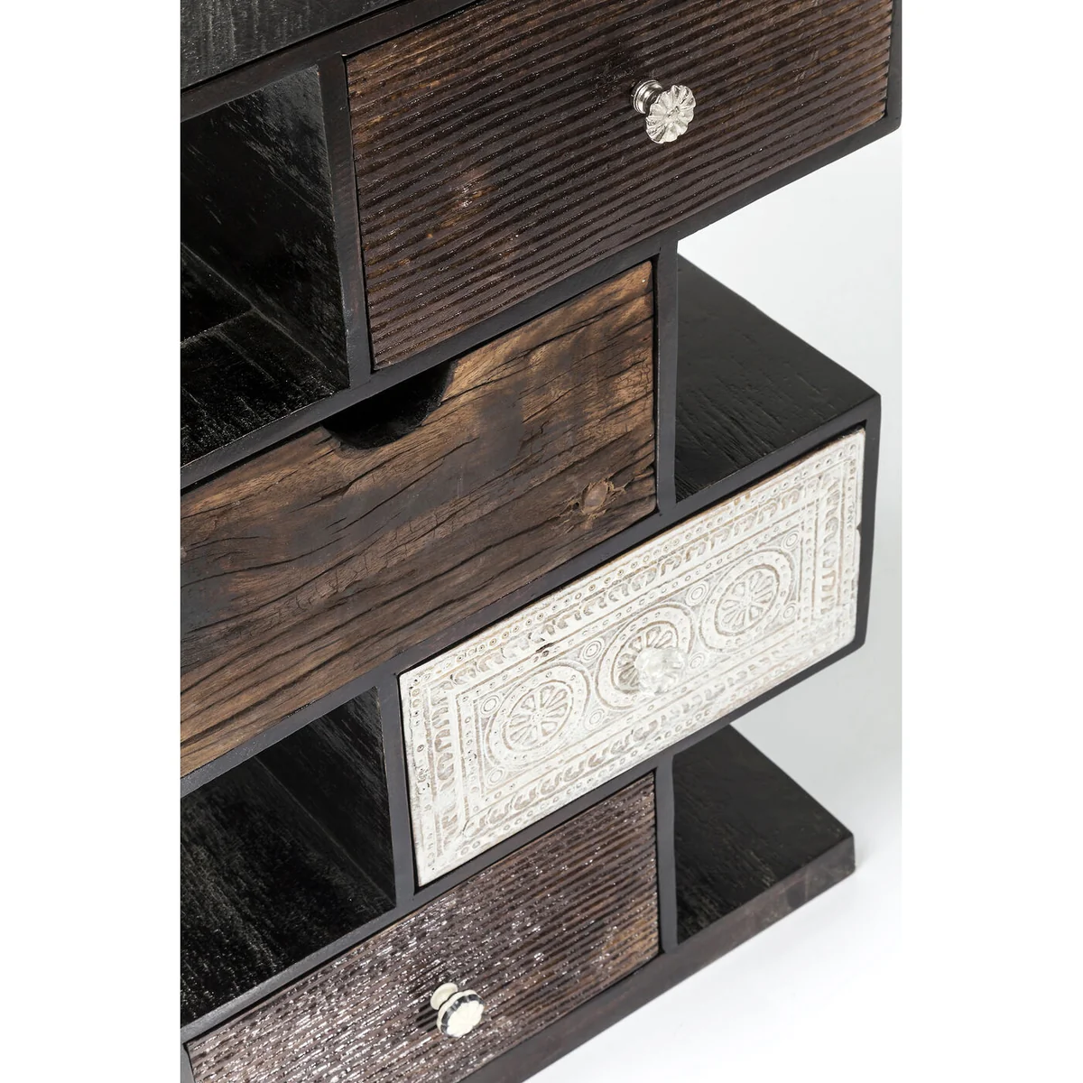 ● Chest of drawers made of solid wood in a creative zig-zag design with lots of adorable details and six practical drawers ● The interior colours of natural white, black and brown are ideally combinable. The mix of fronts and the various knobs are both imaginative and individual ● Natural, with grooves and carved ornaments - the fronts are witness to traditional craftsmanship at its best ● These pieces put the fun into furnishing Simple unpack and set up, because the furniture is supplied fully assembled ● Whether in neutral furnishing colours, in casual black and white styling or as an eye catcher for the urban jungle look, the Finca range will add lots of charm to every room
