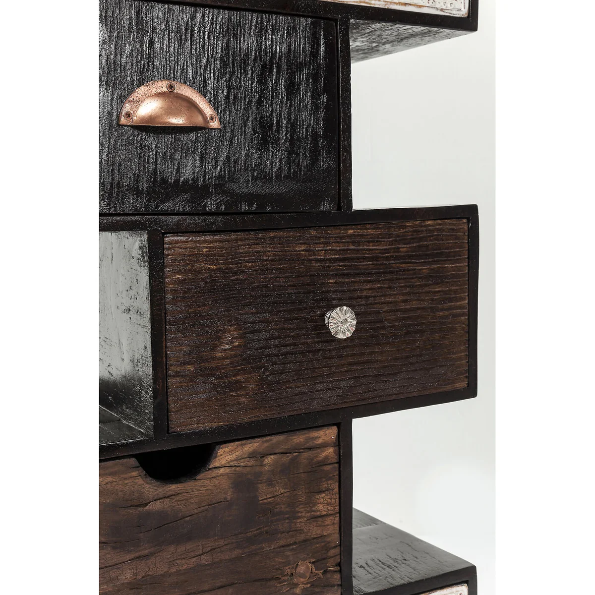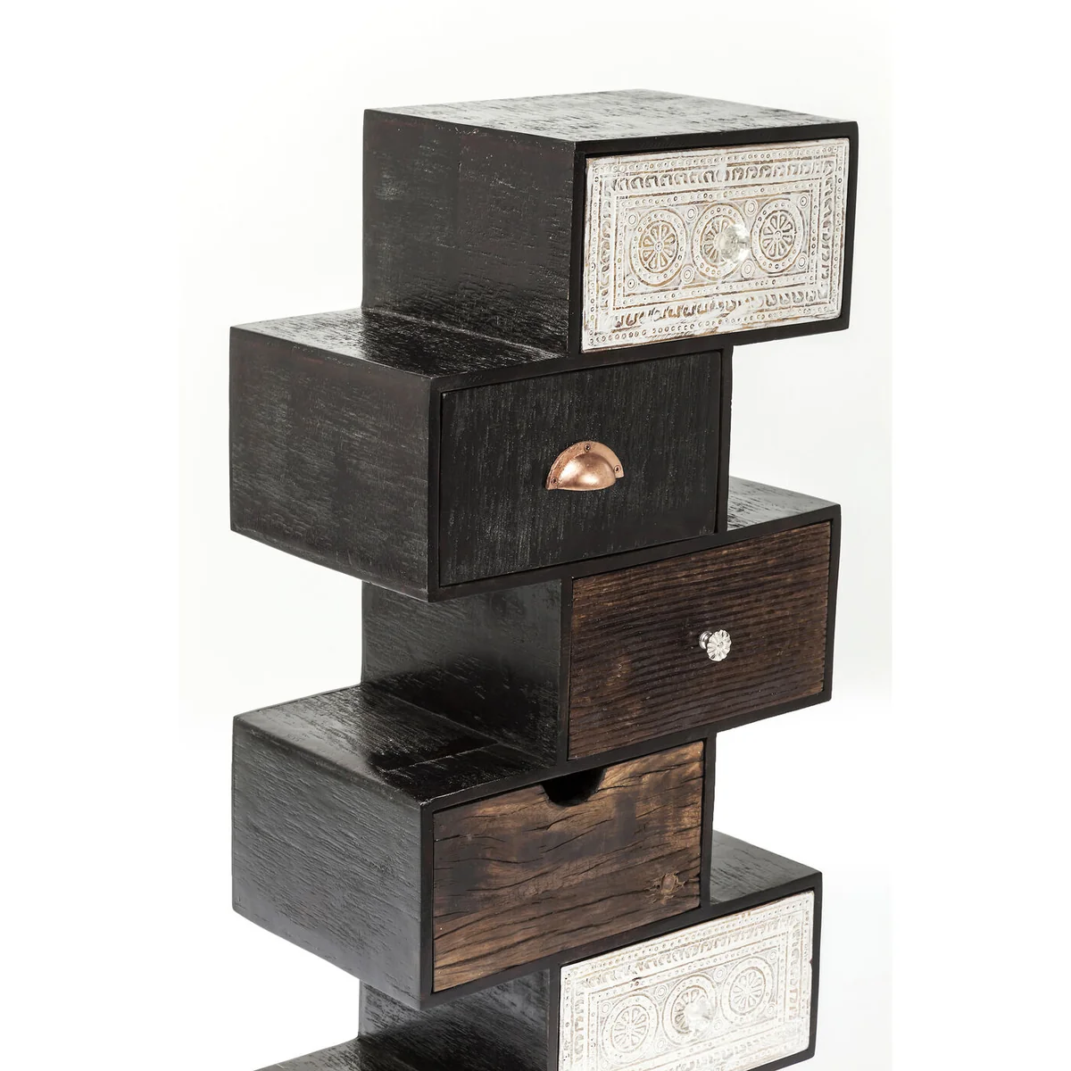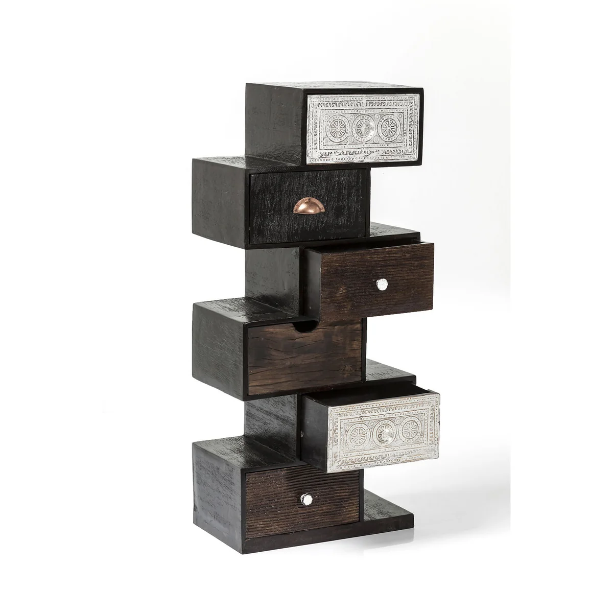 ● Chest of drawers made of solid wood in a creative zig-zag design with lots of adorable details and six practical drawers ● The interior colours of natural white, black and brown are ideally combinable. The mix of fronts and the various knobs are both imaginative and individual ● Natural, with grooves and carved ornaments - the fronts are witness to traditional craftsmanship at its best ● These pieces put the fun into furnishing Simple unpack and set up, because the furniture is supplied fully assembled ● Whether in neutral furnishing colours, in casual black and white styling or as an eye catcher for the urban jungle look, the Finca range will add lots of charm to every room