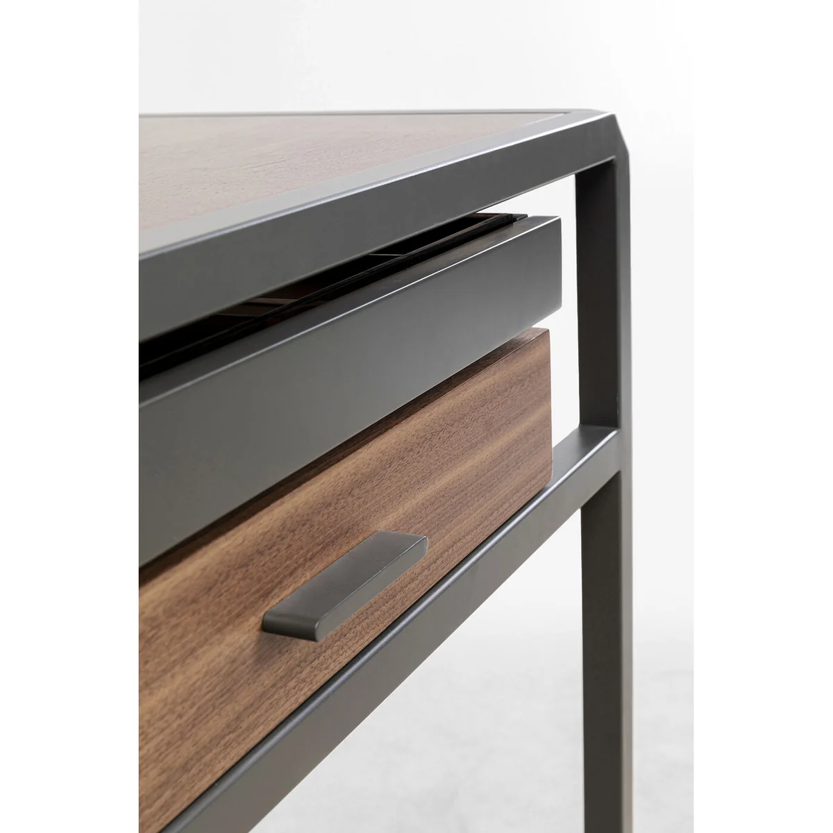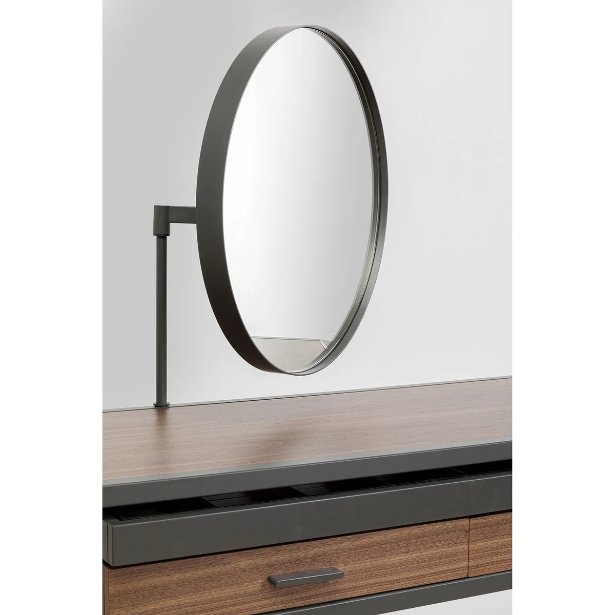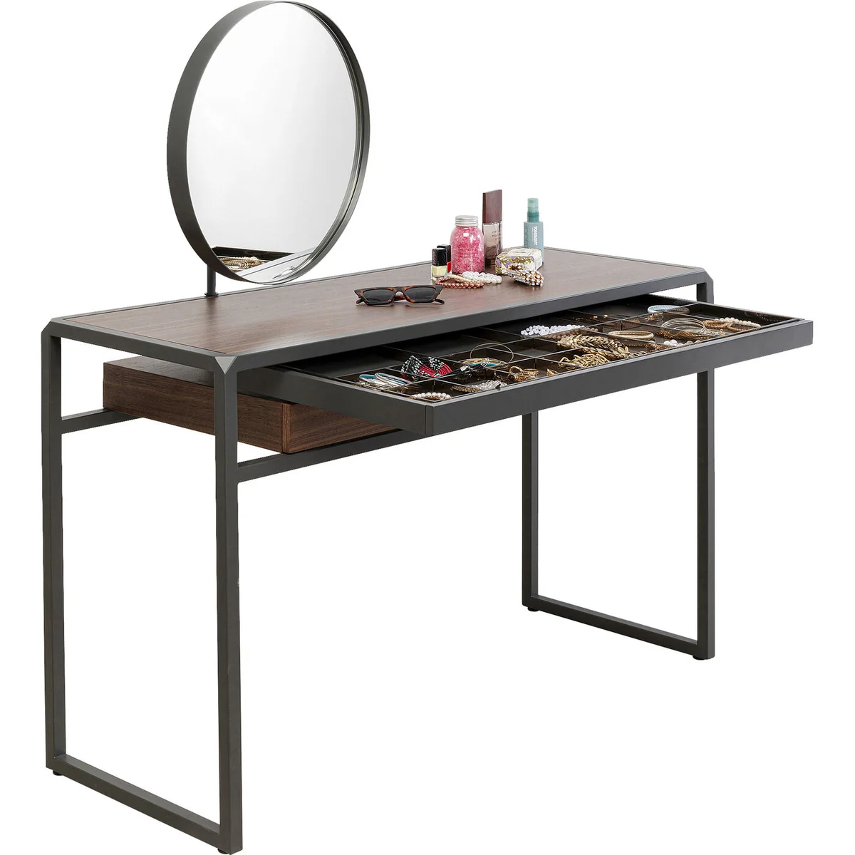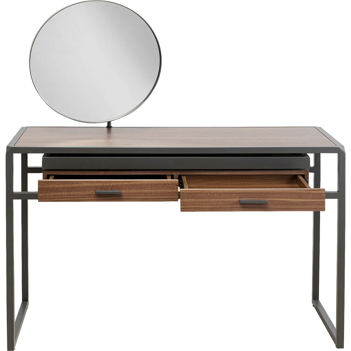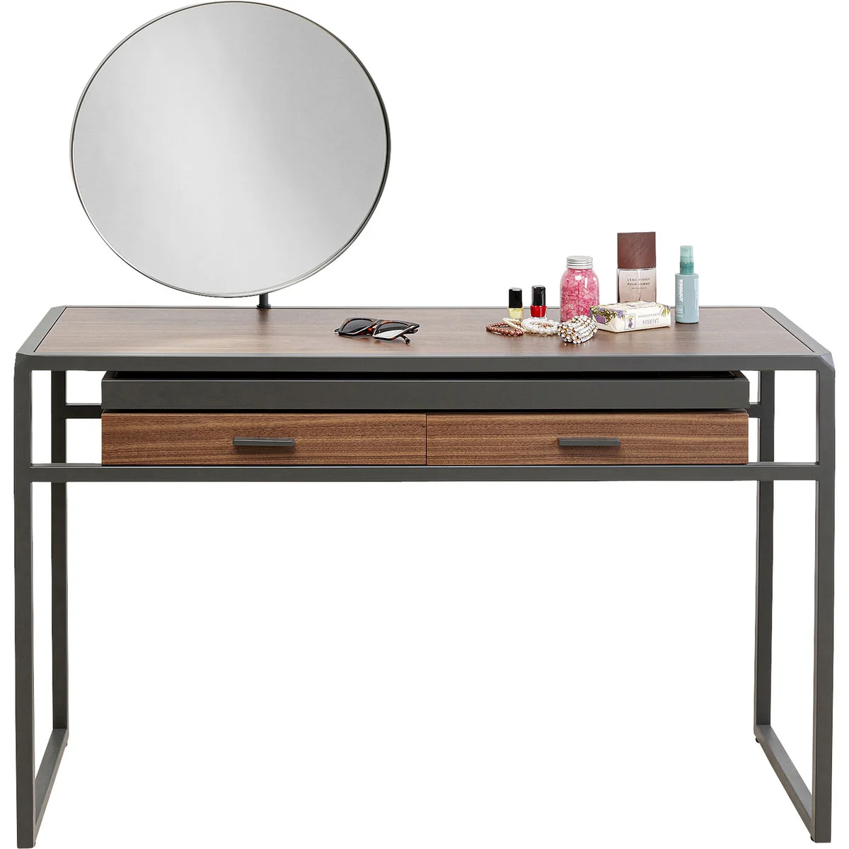 This wooden dressing table with its fine walnut veneer and metal frame will be a highlight in the dressing room or make-up corner in the bedroom. Bravo also does a good job as a console table in the hallway. Thanks to the two roomy drawers you have enough storage space for all your jewellery and cosmetic products. The black, powder-coated steel frame gives the table a modern touch, while the round mirror is perfect for putting on make-up. The make-up mirror can be swivelled to suit your needs. Its high-quality materials and stylish design make this dressing table a classy piece of furniture that will enhance any interior.