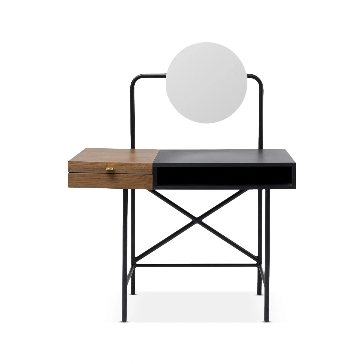 • A seriously elegant dressing table with a round mirror in fine walnut veneer and black
