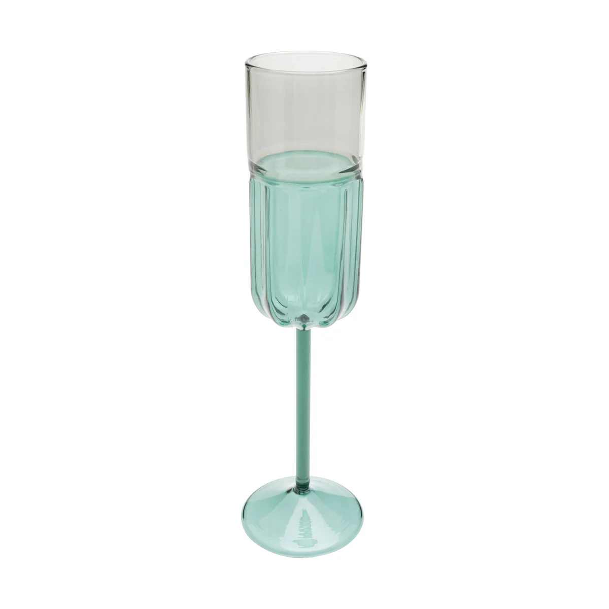 The Duetto Champagne Glass in rich green colored glass is a stylish and versatile addition to any dining arrangement. Its cool, fascinating accents change with the light, making it a true eye-catcher.