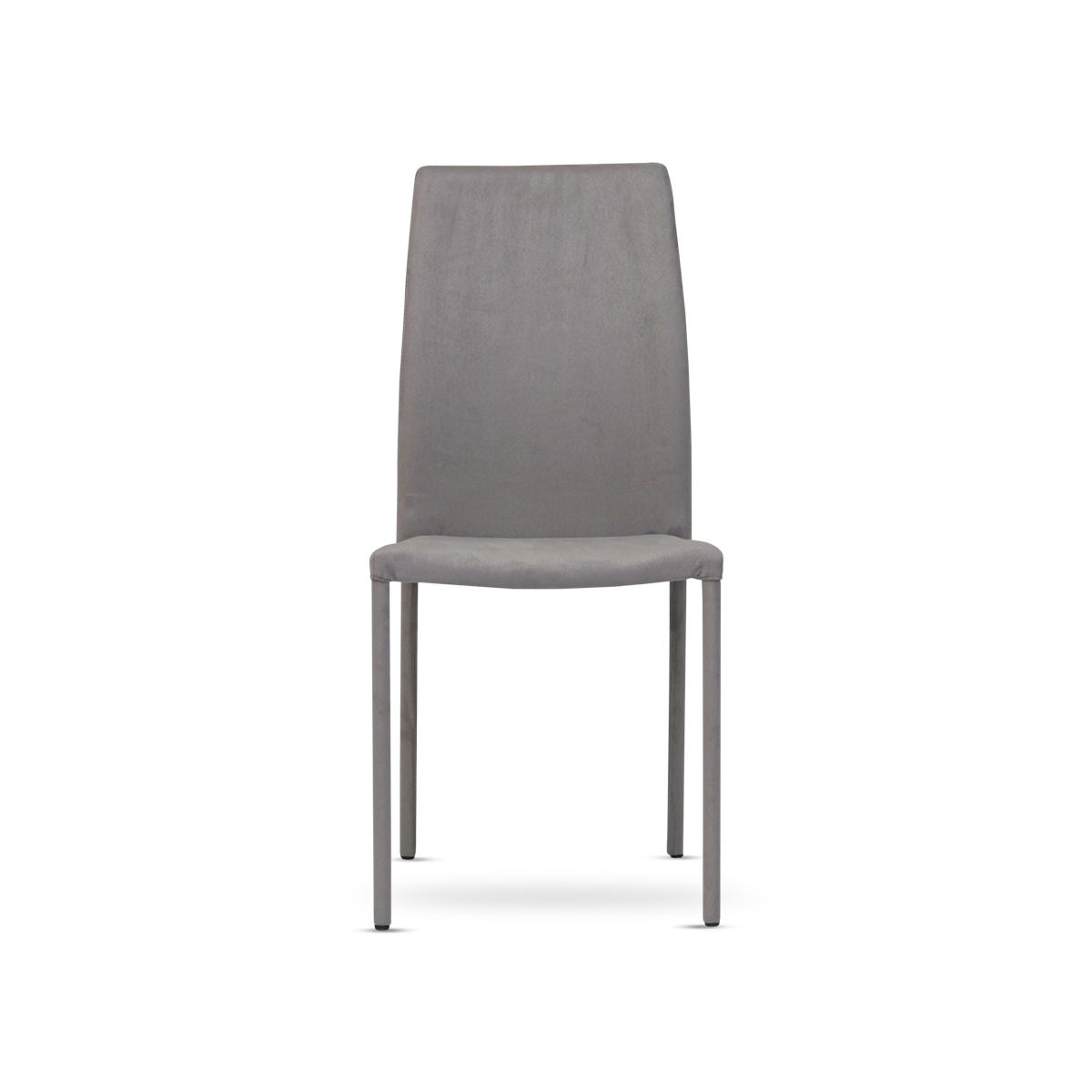 The Emilia Dining Chair in light grey combines minimalist design with luxurious comfort. The matte black frame complements the soft grey upholstery, creating a refined look that fits seamlessly into any dining space with a modern aesthetic.