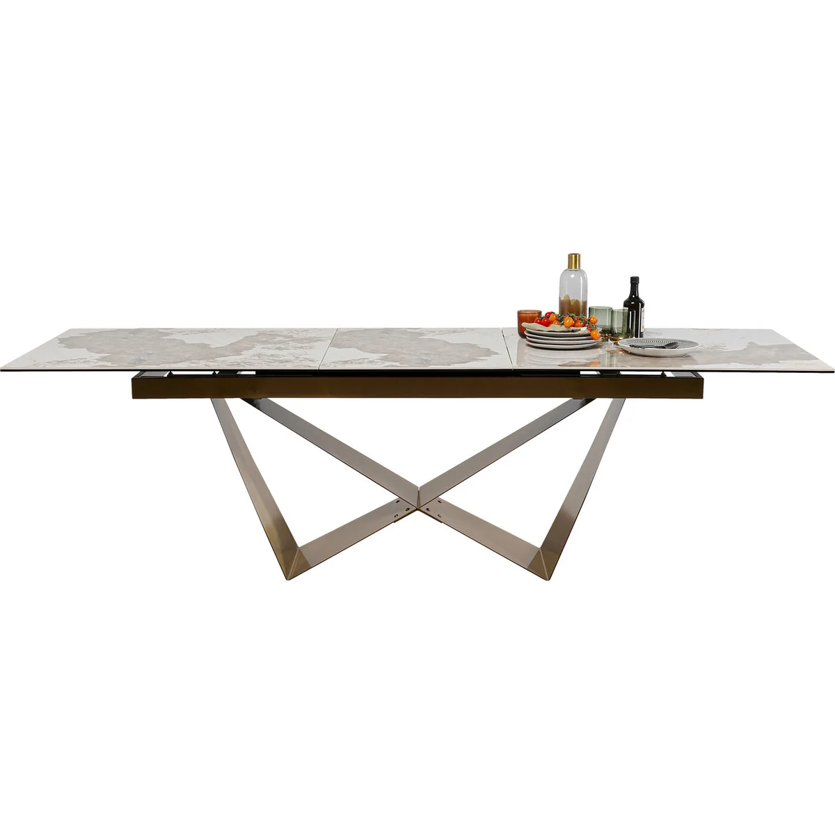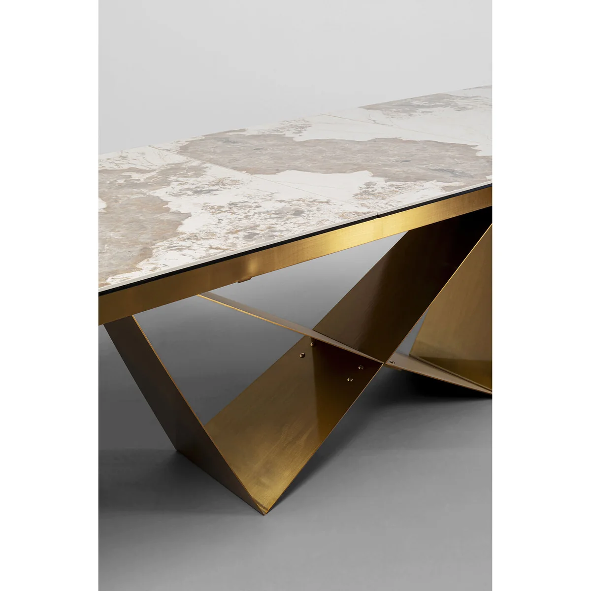 The Connesso Extension Dining Table in beige ceramic and brass is a refined centerpiece for modern dining rooms. This extendable dining table combines contemporary design with practicality, making it ideal for both family meals and entertaining guests.