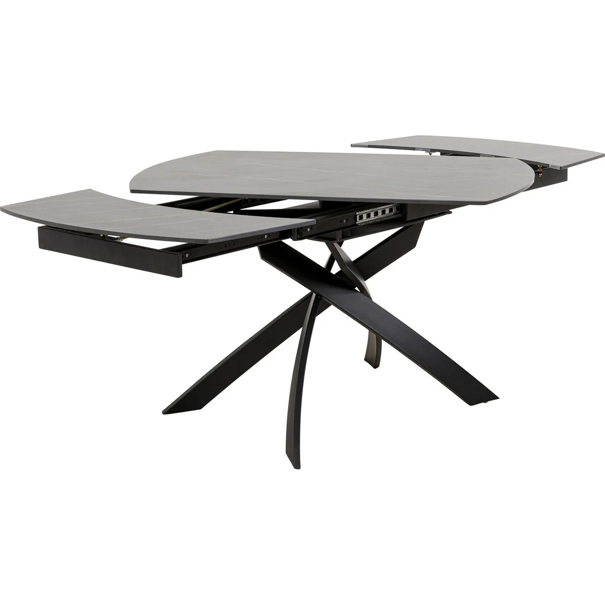 The table extends from 120 cm to 180 cm with an ingenious swivel mechanism, providing spacious seating for 4 to 8 people. Its durable ceramic top rests on toughened safety glass for extra stability, while the powder-coated steel frame features a distinctively curved design. The modern dining table’s surface is scratch-resistant, easy to clean, and visually striking.