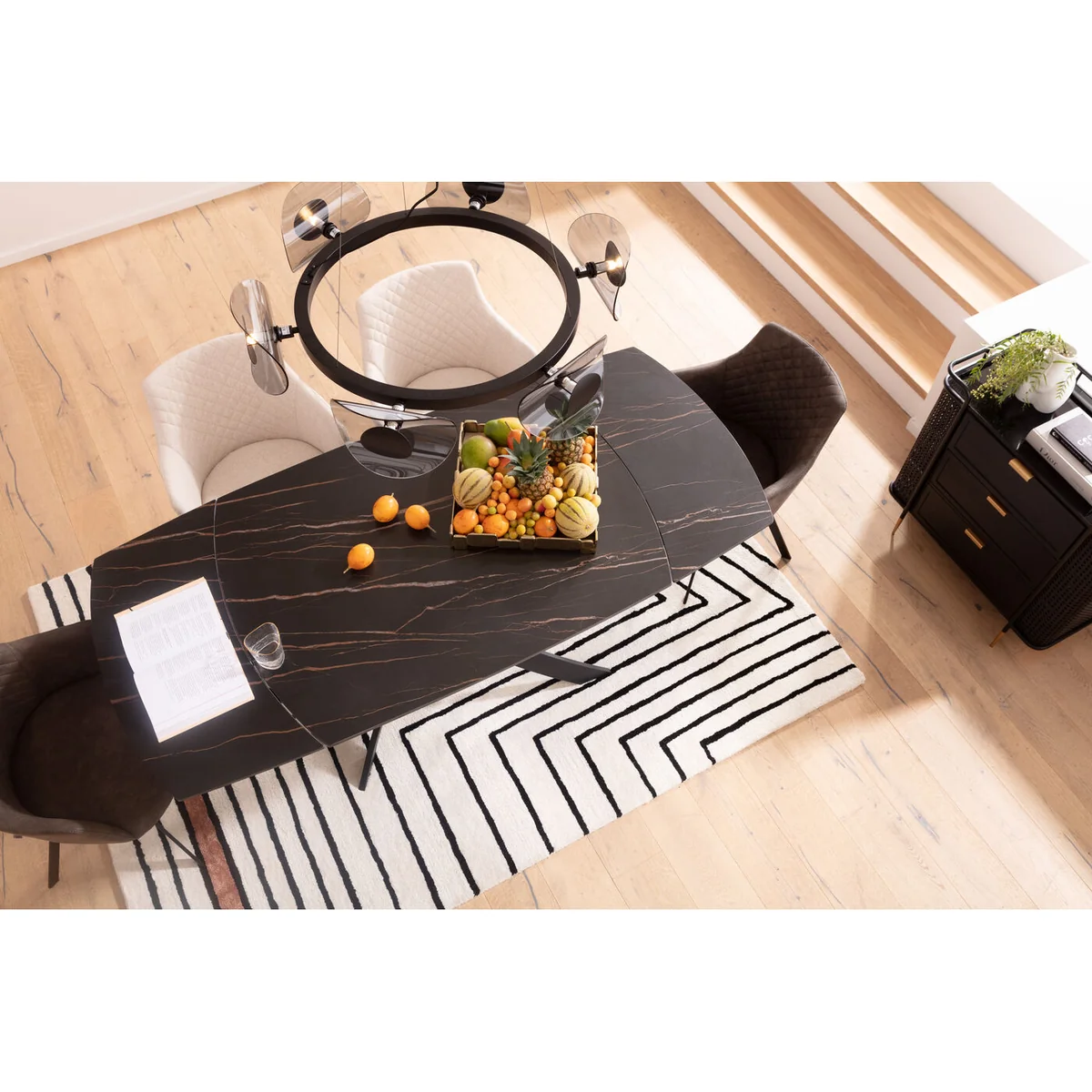 Perfect for entertaining or daily meals, this black ceramic dining table ensures flexibility without sacrificing sophistication. Enjoy effortless transitions from intimate dinners to larger gatherings, all while enhancing your dining space with a contemporary, designer-inspired look.