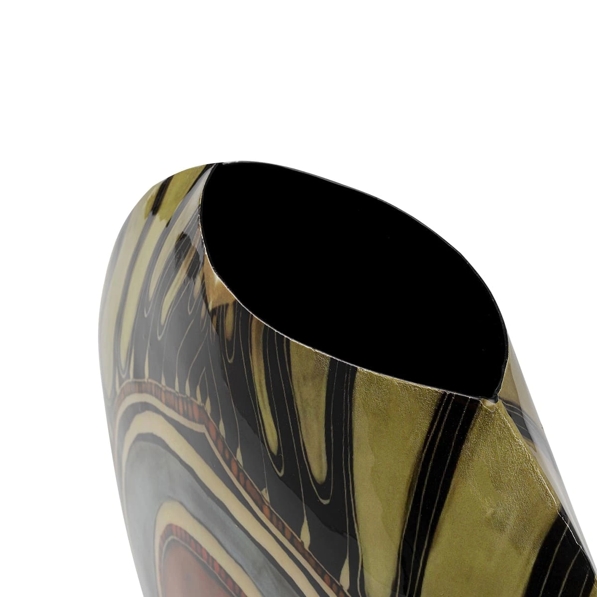 Key features of this vase include its unusual organic pattern in natural colors, a sweeping shape that beautifully showcases bouquets or dry arrangements, and its durable, shiny surface made from lacquered aluminum. Each vase, measuring 41x7x30 centimeters (H/W/D), is a unique piece, carefully handcrafted to perfection.