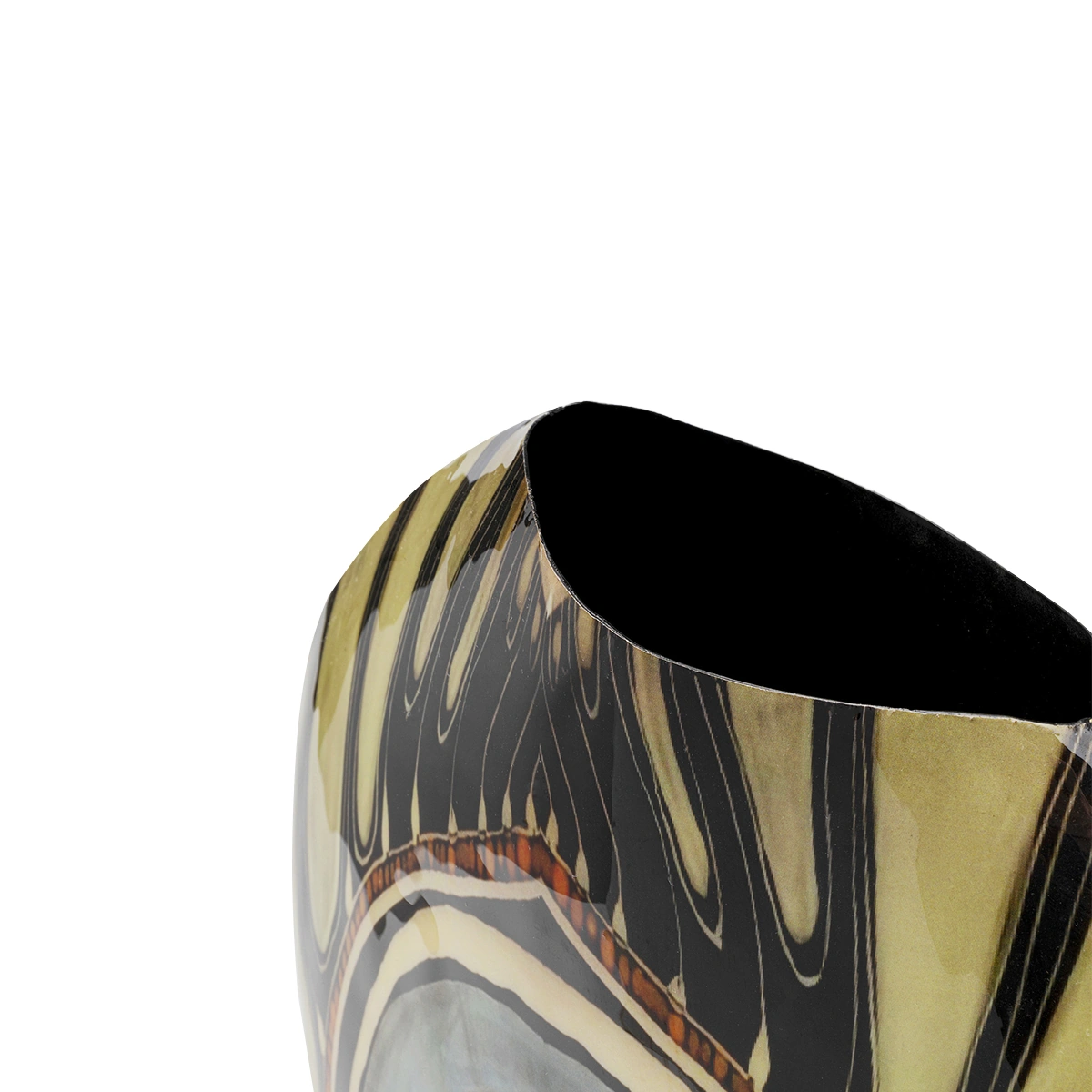 The vase stands at 31x7x25 centimeters, showcasing an unusual organic pattern in natural colors. Crafted from lacquered aluminum, this vase's sweeping shape is perfect for showcasing bouquets or dry arrangements. Each piece is unique, handcrafted with a shiny surface and a robust finish.