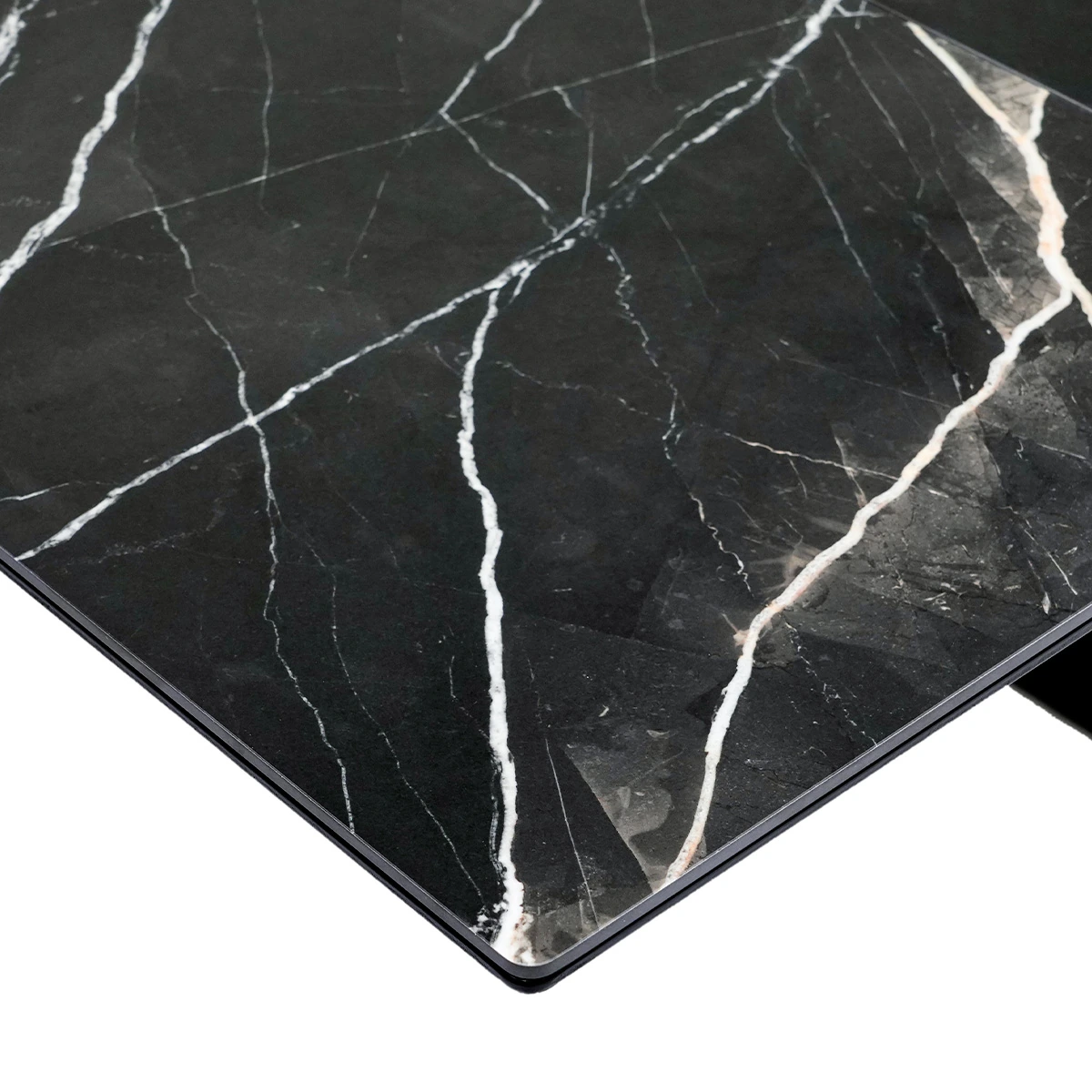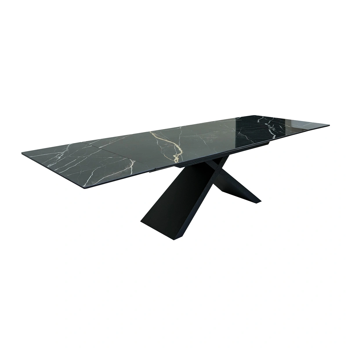 The Fargo Extendable Dining Table is perfect for those who love flexibility and style. Featuring a chic ceramic top and a black base, this table can be extended to accommodate guests with ease. Its modern design pairs well with minimalist or industrial chairs, creating a refined, functional centerpiece for your dining area.