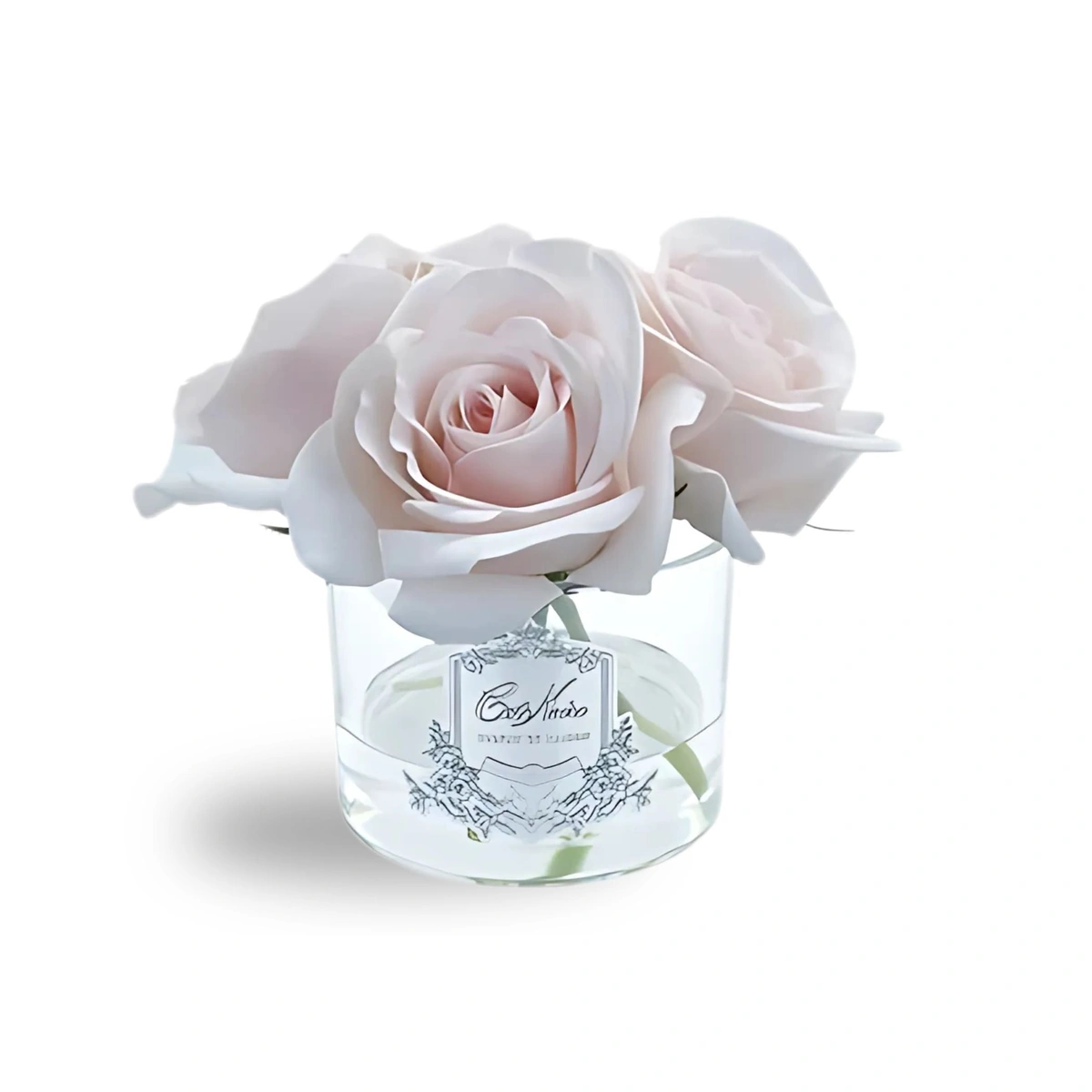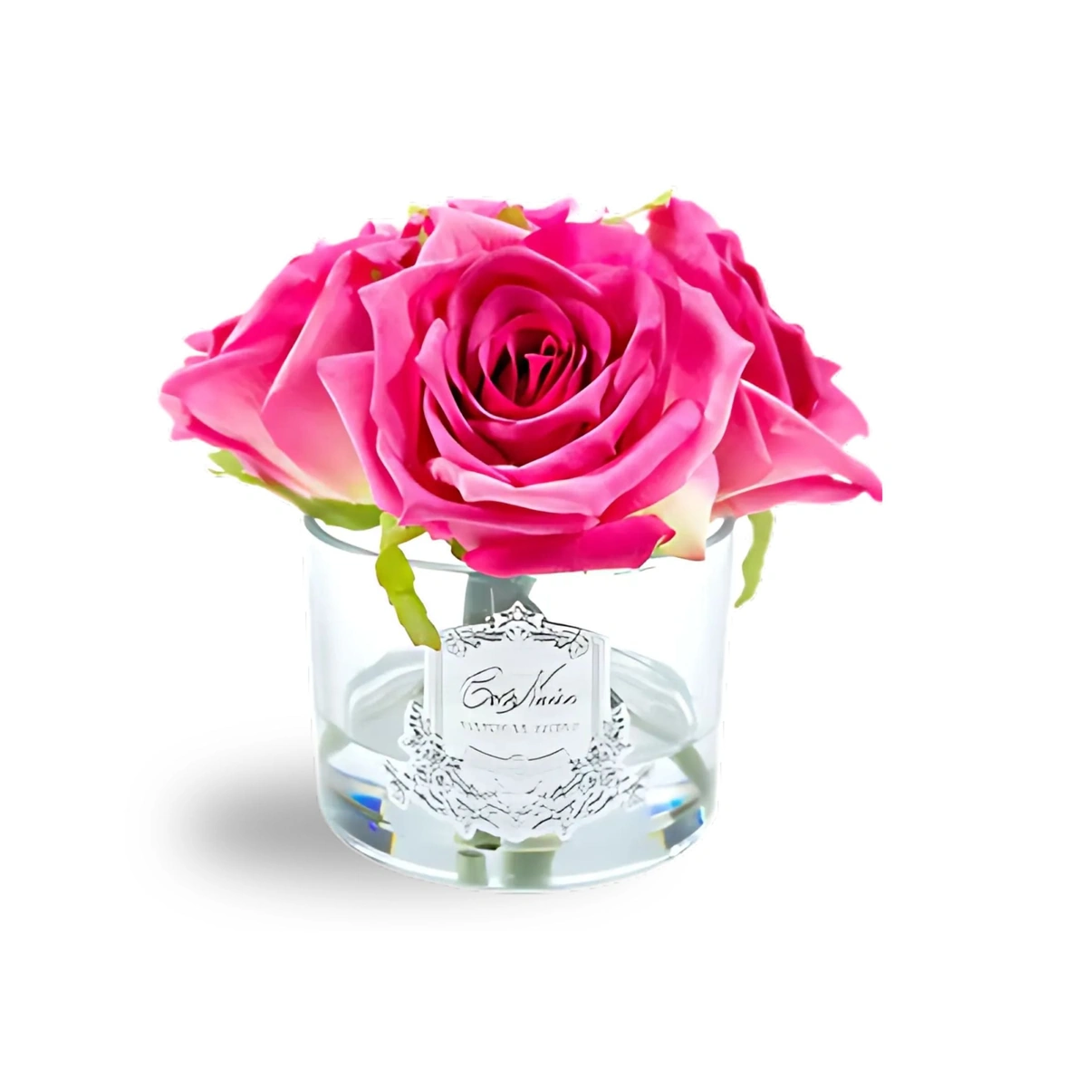 Five scented, life-like roses in clear gel-filled vase with silver badge. Handcrafted, realistic, and beautifully detailed. Made in Portugal