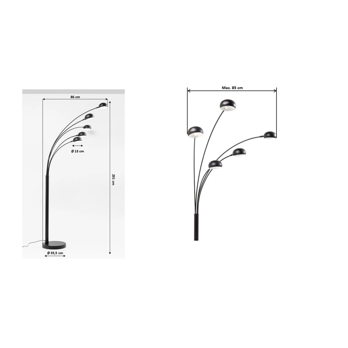 Standing at 201 cm, with a width of 85 cm and a length of 86 cm, the lamp is made of high-quality lacquered steel. The black matt finish gives it a sophisticated, modern appearance that fits well in any decor. The lamp features five individual 'fingers', each of which can be adjusted and positioned as desired, providing flexible lighting options.