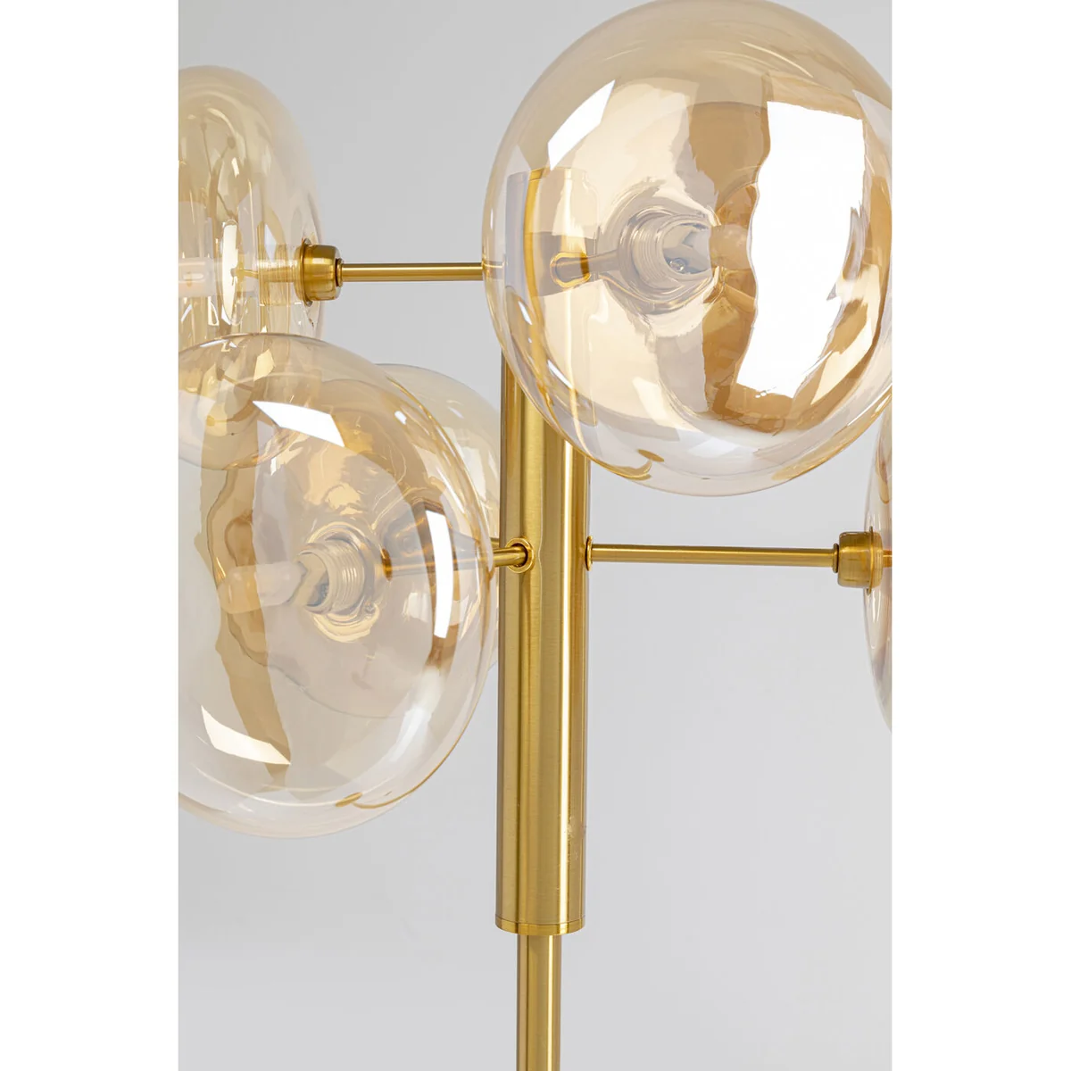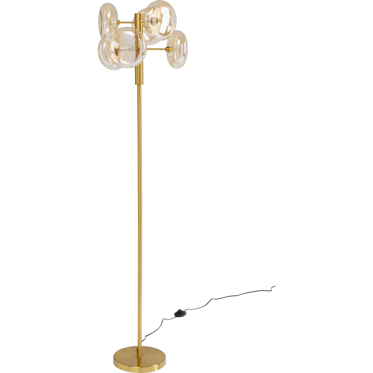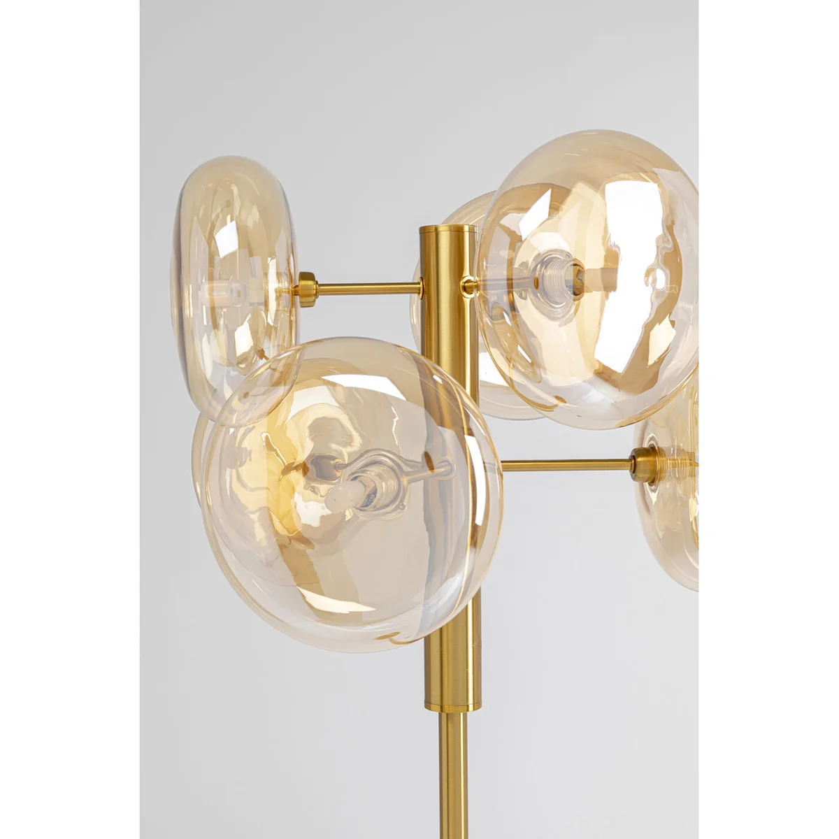 - Standard lamp in gold made of metal 63x43x43cm (W/H/D) - The 6 organically shaped, lens-shaped lampshades made of glass are the design highlight - Thanks to a special coating, the glass has a light reflecting shimmer in a golden tone - The stand and round base are made of steel finished with brass - Bulbs LED 6x G9, 50/60 Hz, max. 30 W