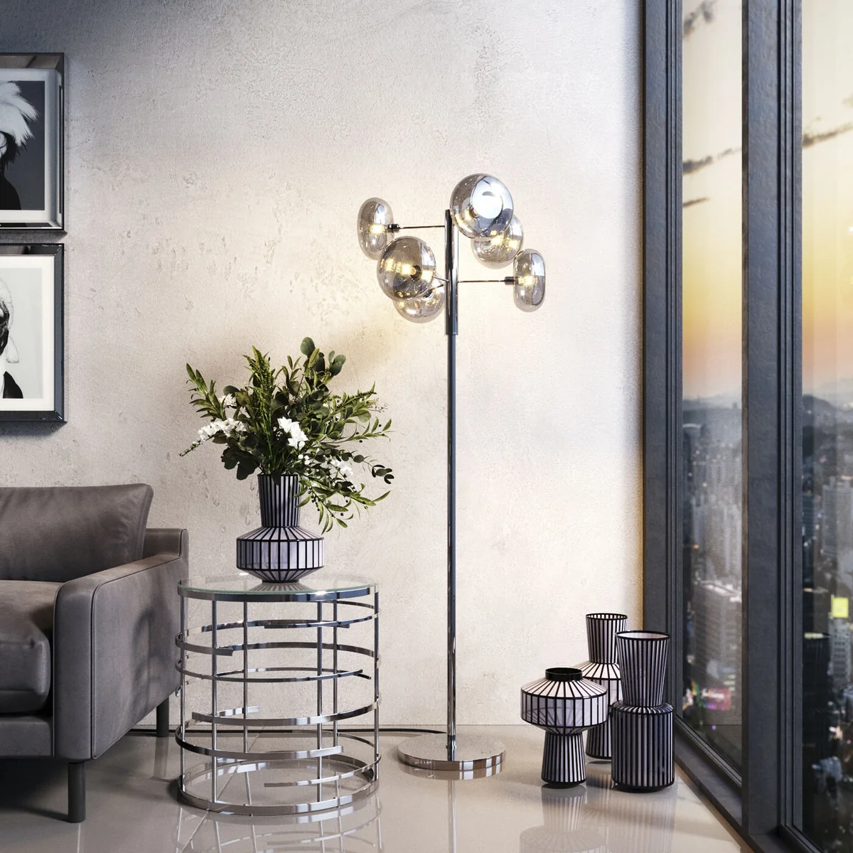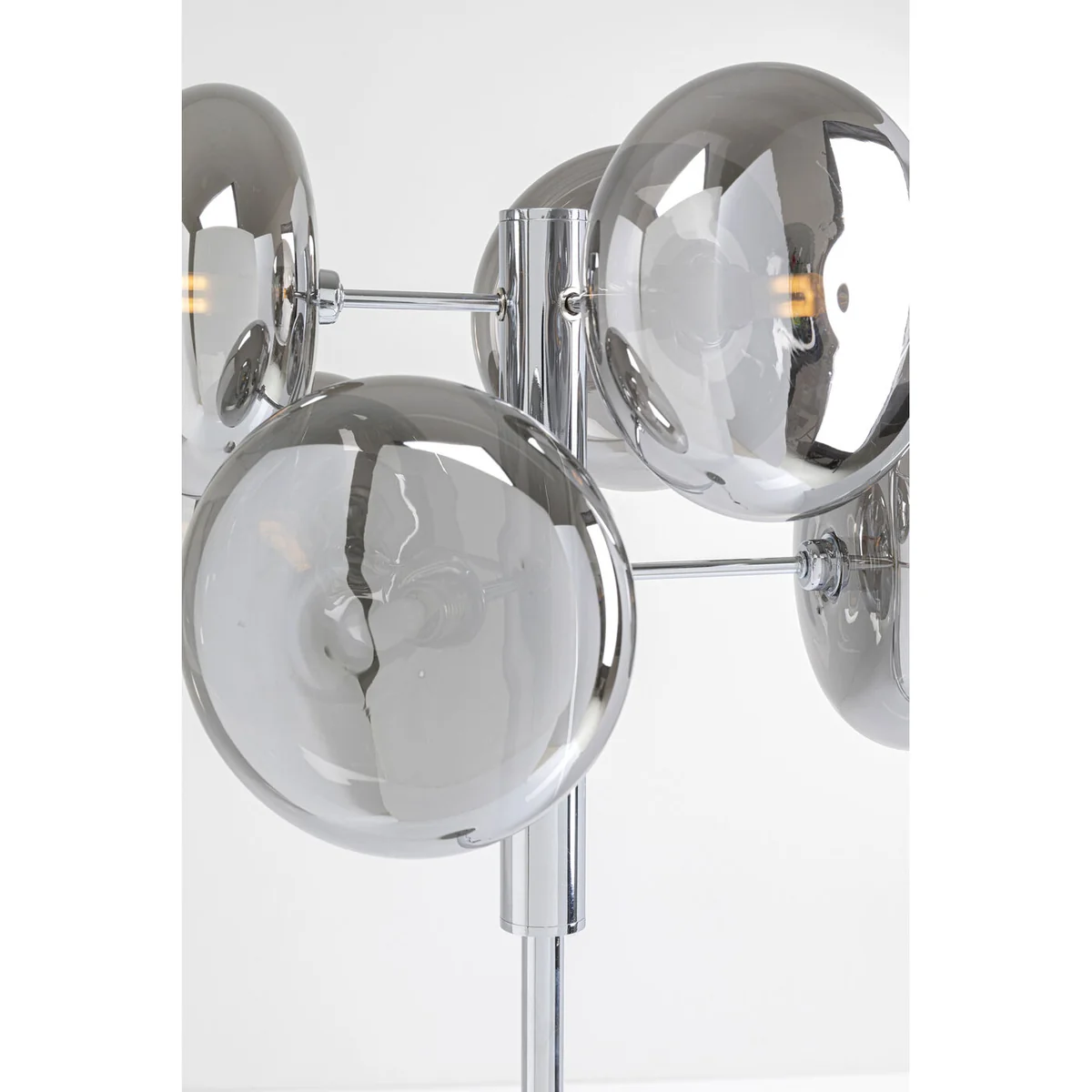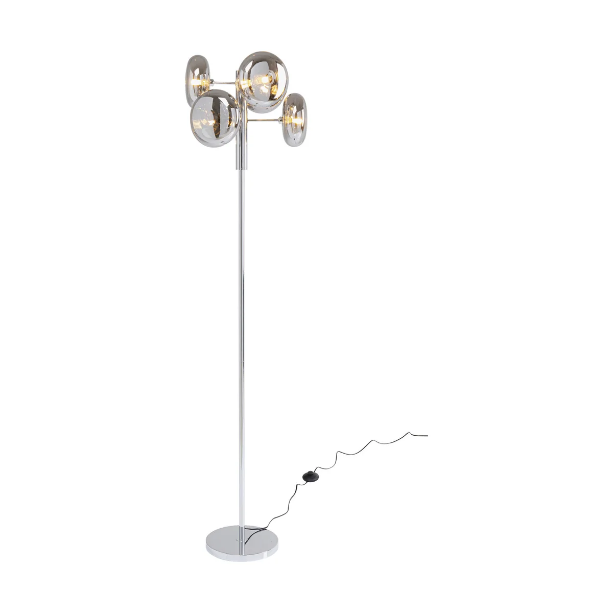 - Silver floor lamp made of metal sized 163x43cmx43 cm (H/W/D) - The six organically formed, lentil-shaped lampshades made of glass are the design highlight - The glass shimmers with a silvery mirrored and semi-transparent effect thanks to a special coating - This modern standard lamp made of chrome-plated metal provides indirect light in the living room - Bulbs LED 6x G9, 50/60 Hz, max. 30 W