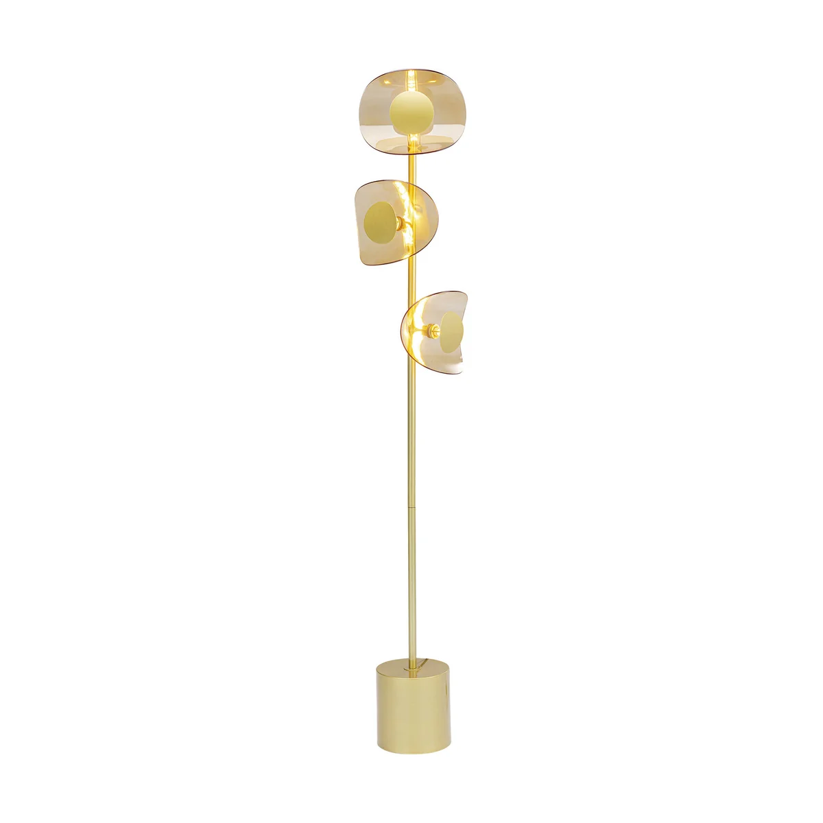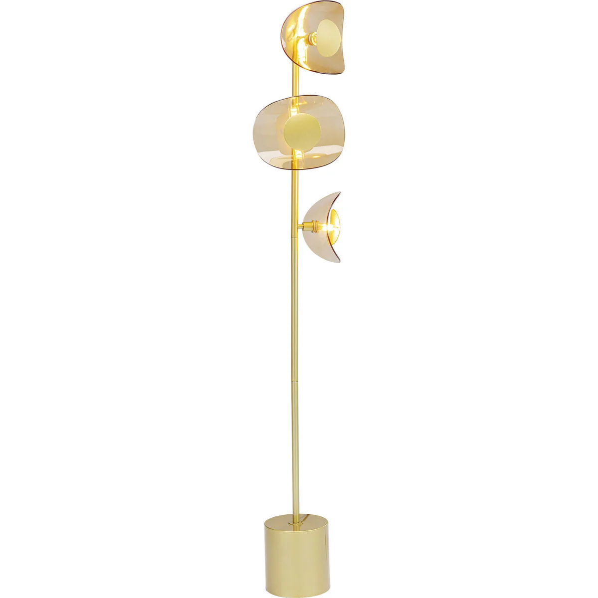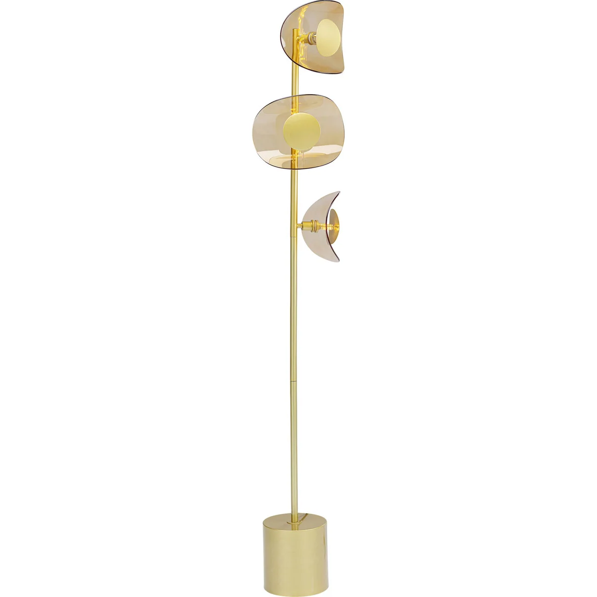 - Elegant, large floor lamp in an extravagant look in gold - Made of high-quality nickel-plated steel and tinted glass - Three lampshades in an extraordinary design - Nice and tall as well as slim, this floor lamp fits perfectly between the sofa and the wall, even in smallish rooms - A heavy, solid base for a safe, firm stand