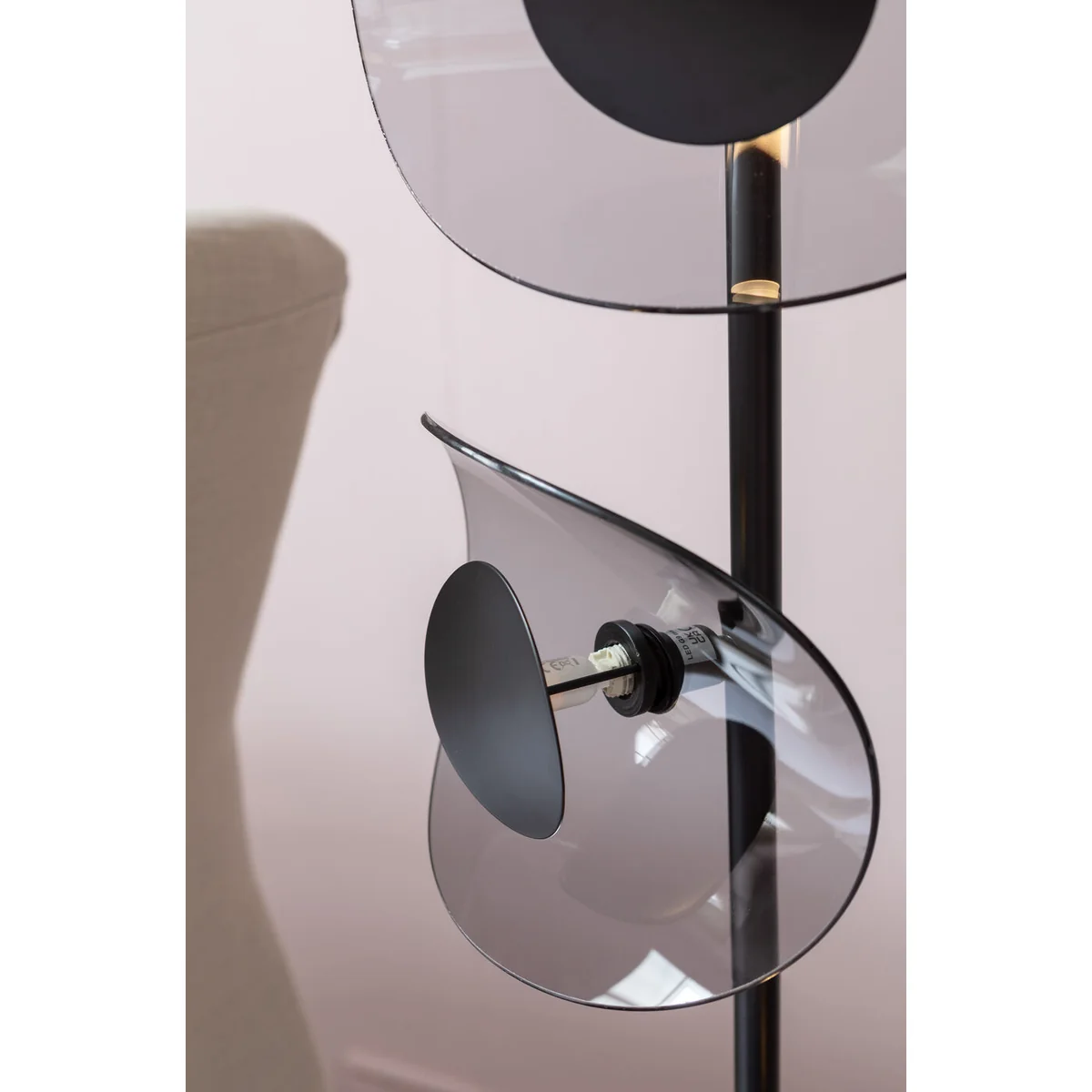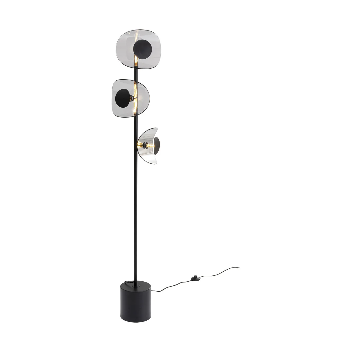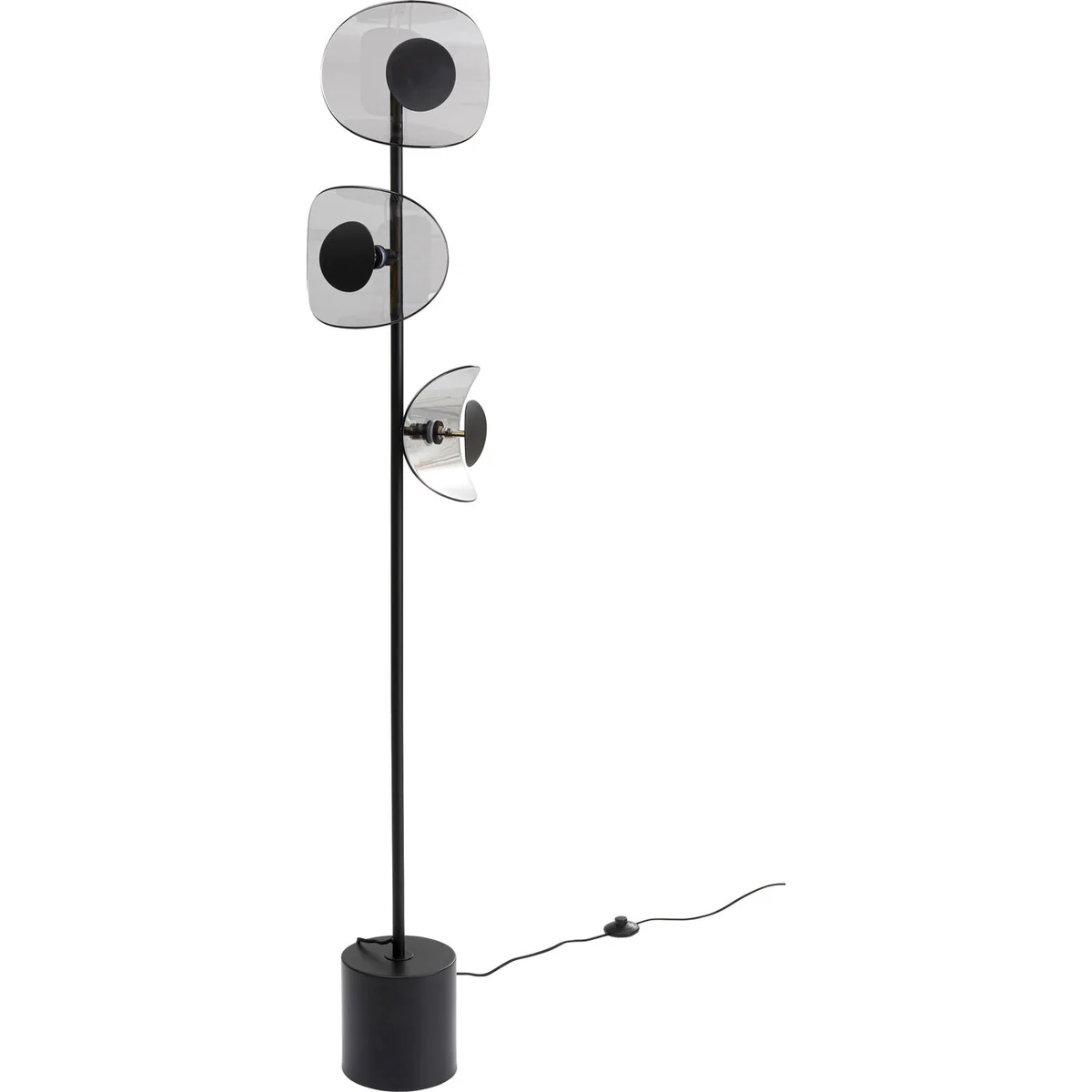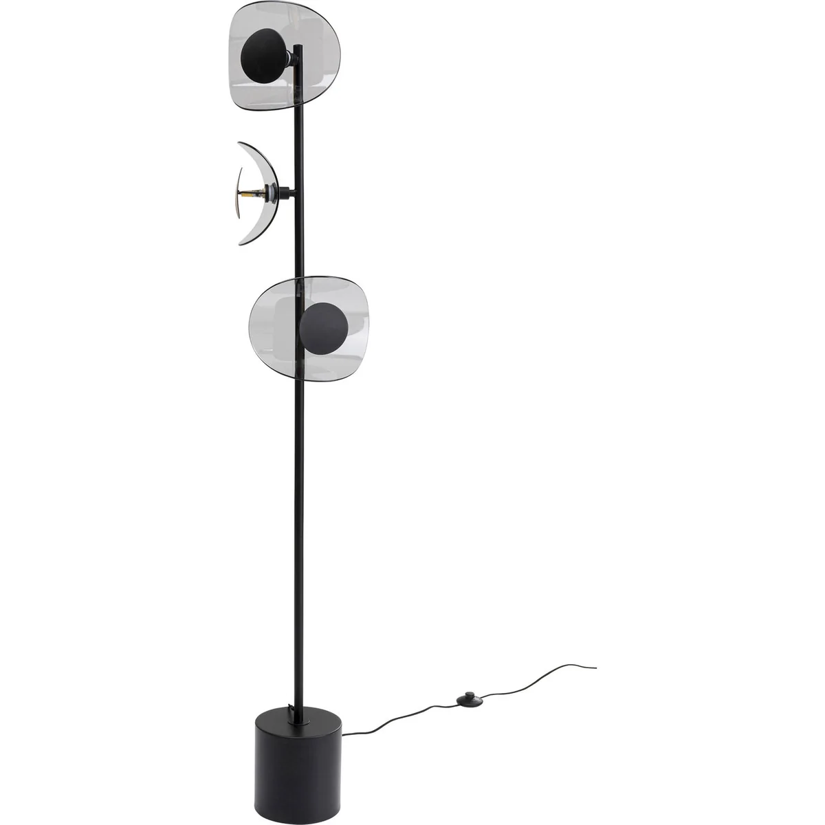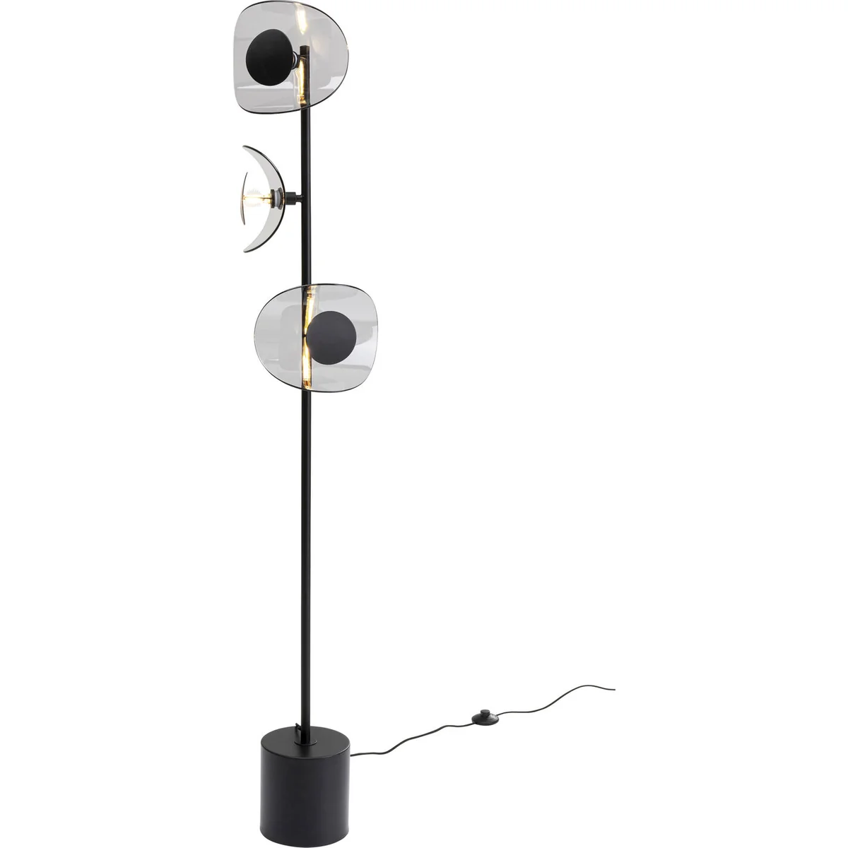 - A modern, 160 cm high LED lamp with a flamboyant look in black - Striking design: the lampshades made of grey-tinted glass with a black reflector - The heavy, solid base provides a safe, firm stand - Indirect and atmospheric light for the living room, hallway, bedroom and office -