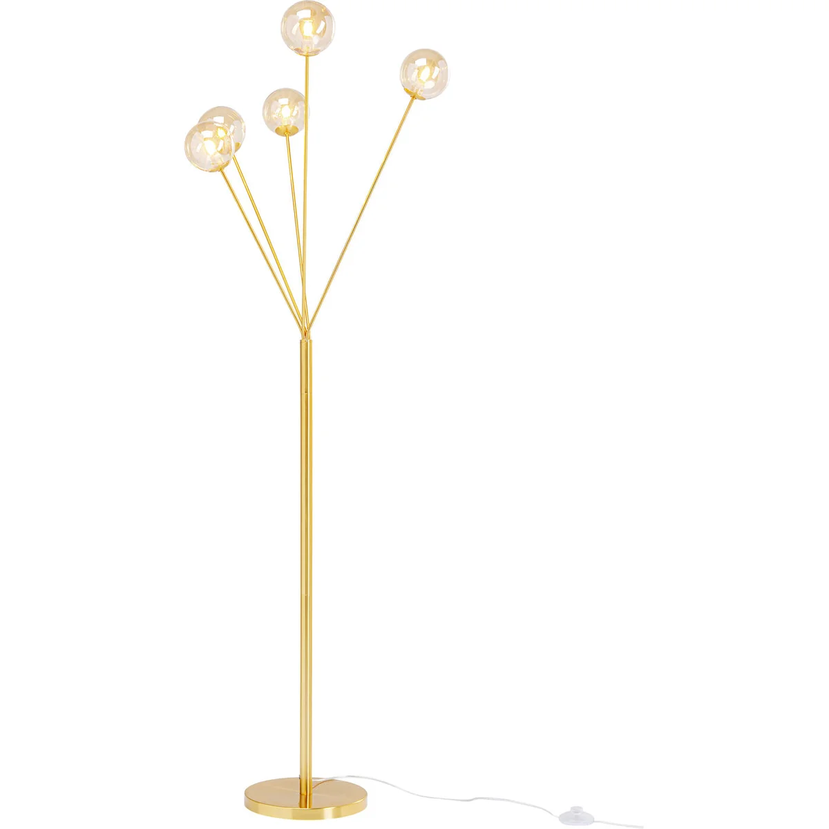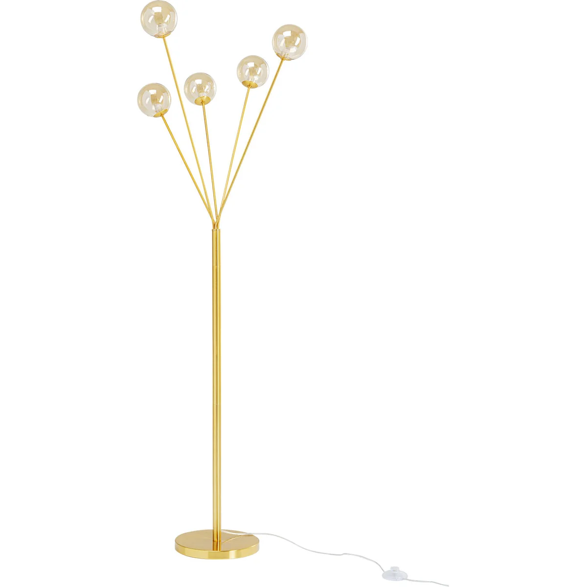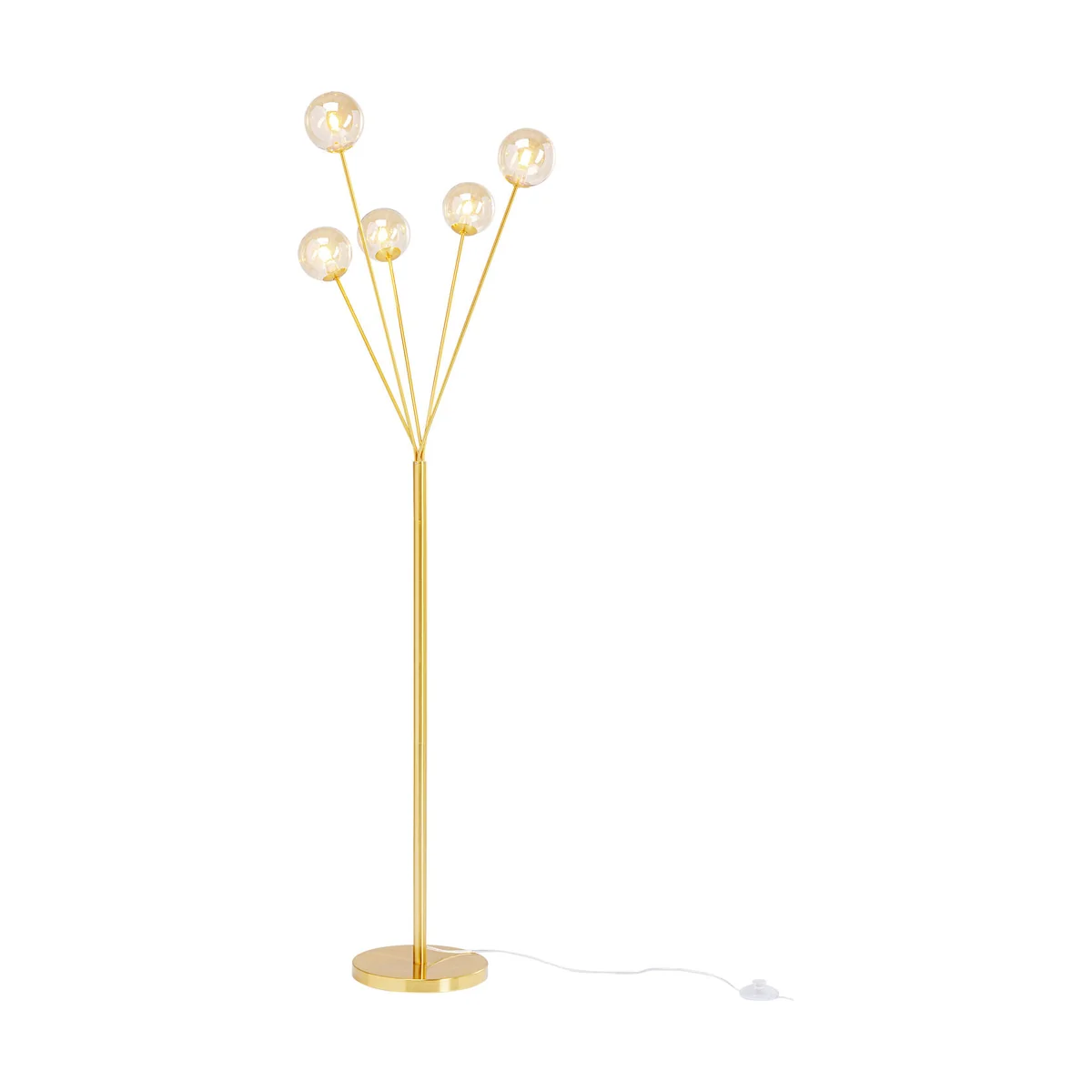 - Large, luxurious floor lamp with five arms in a brass look and glass spheres as lampshades - The glass of the round lampshades is subtly tinted and spreads soft mood lighting - When switched on, the floor lamp provides pleasant light - when switched off, it becomes a decorative object - High-quality: made of steel finished completely in brass - The foot switch and cable merge discreetly into the background thanks to their transparent materials