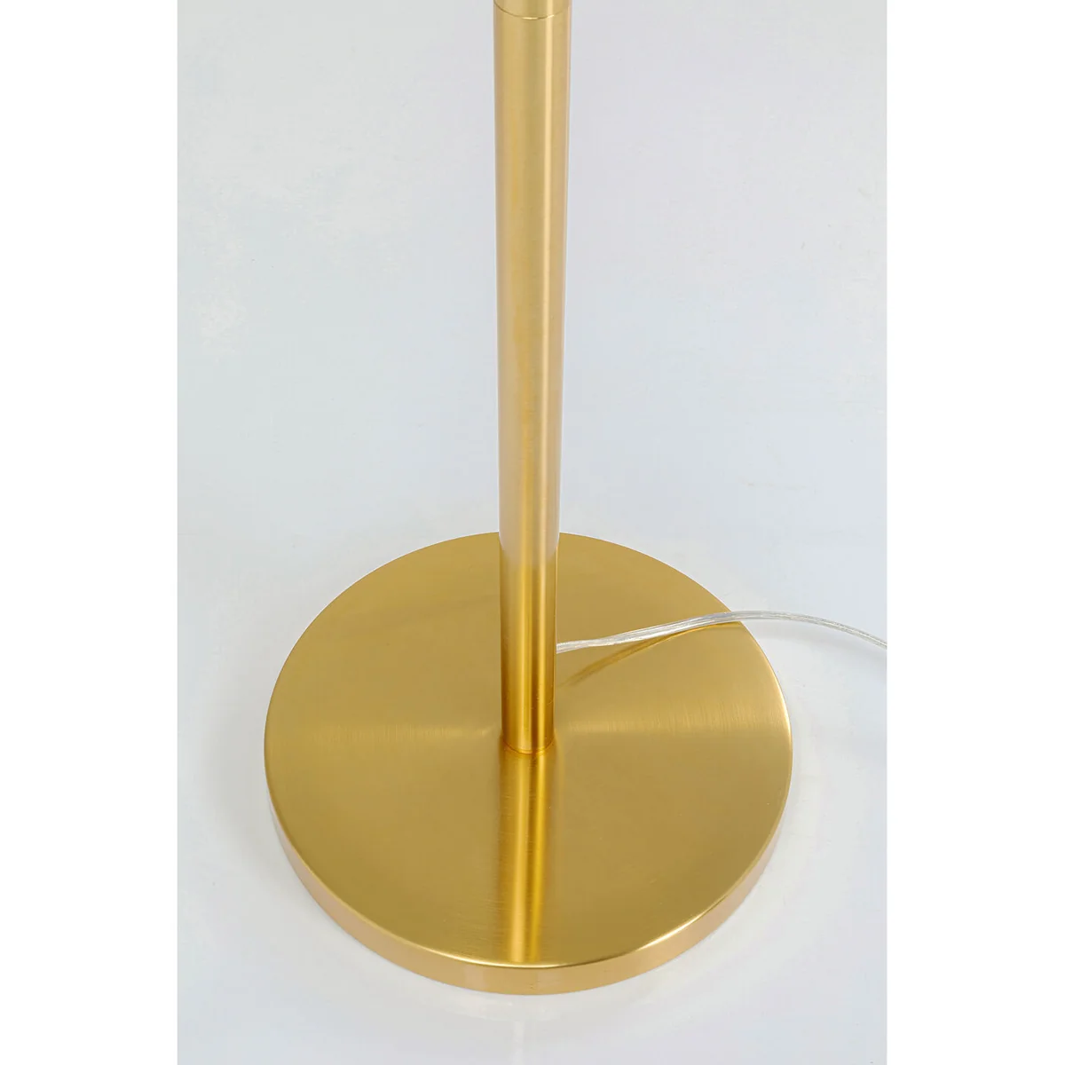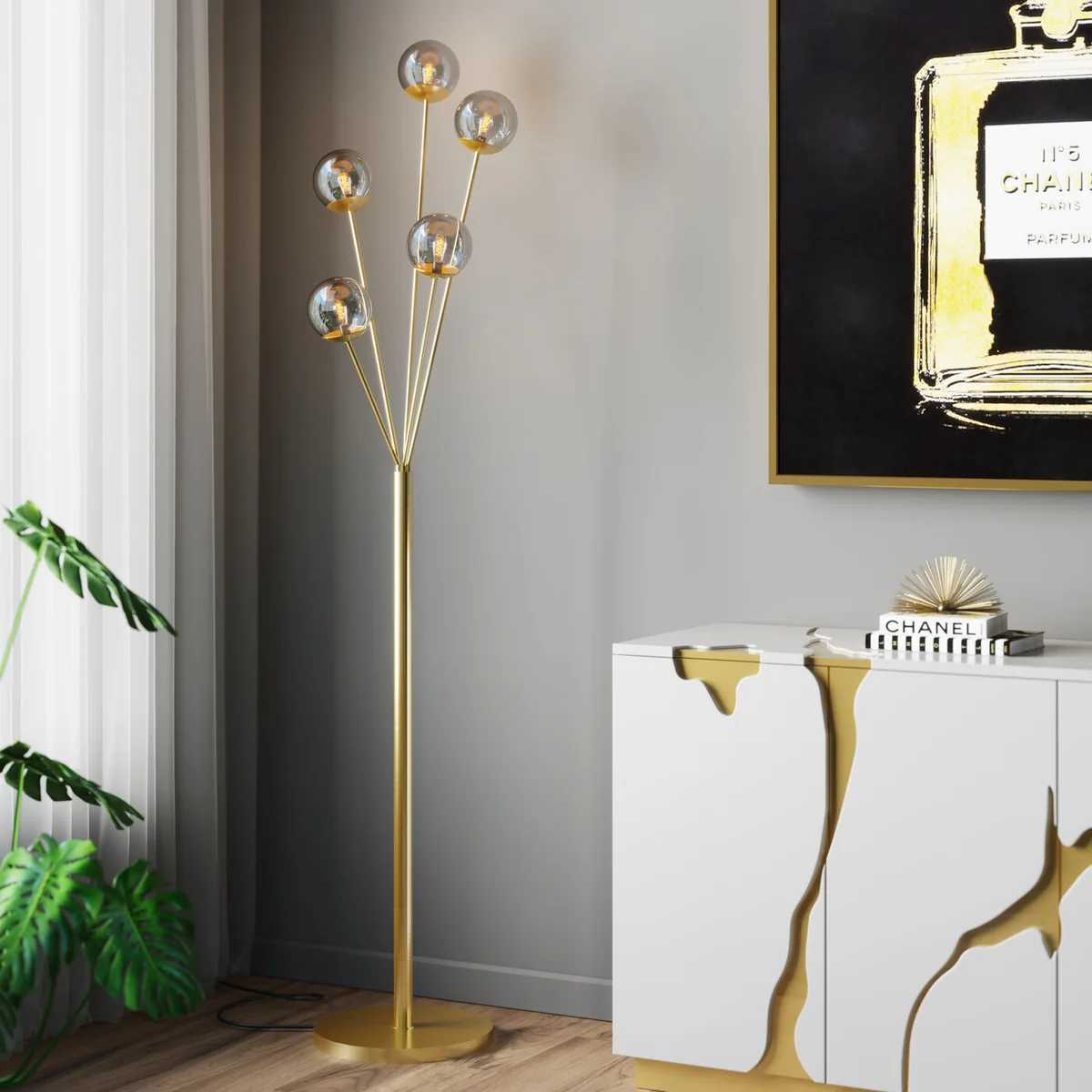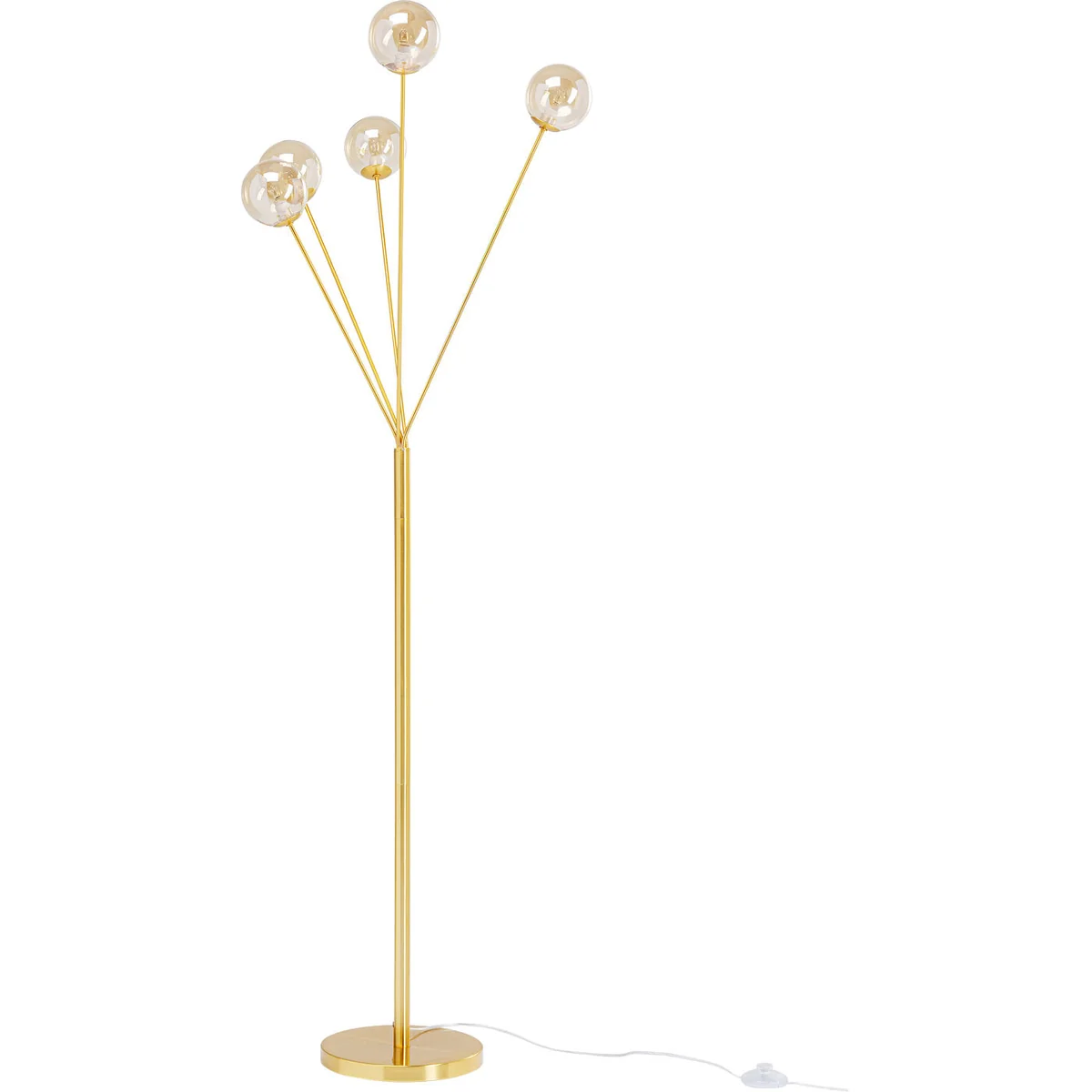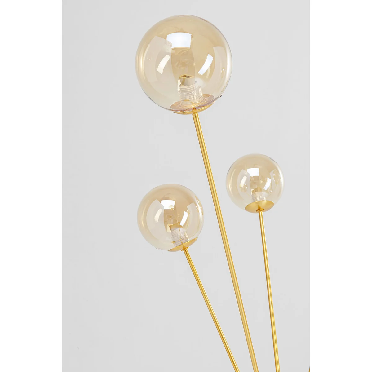 - Large, luxurious floor lamp with five arms in a brass look and glass spheres as lampshades - The glass of the round lampshades is subtly tinted and spreads soft mood lighting - When switched on, the floor lamp provides pleasant light - when switched off, it becomes a decorative object - High-quality: made of steel finished completely in brass - The foot switch and cable merge discreetly into the background thanks to their transparent materials