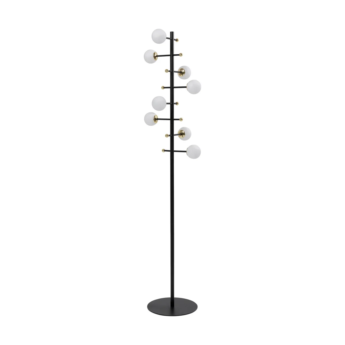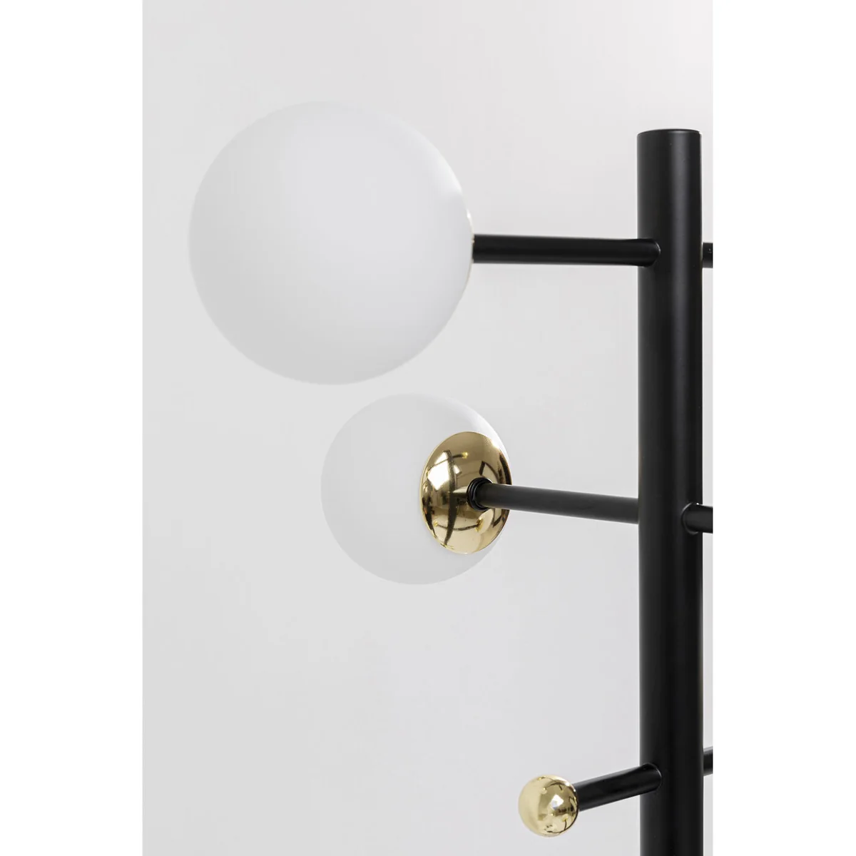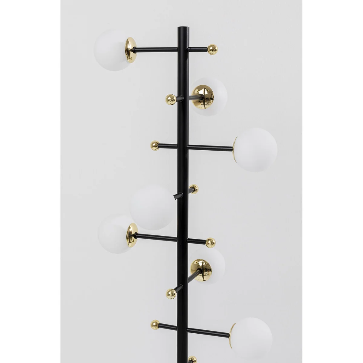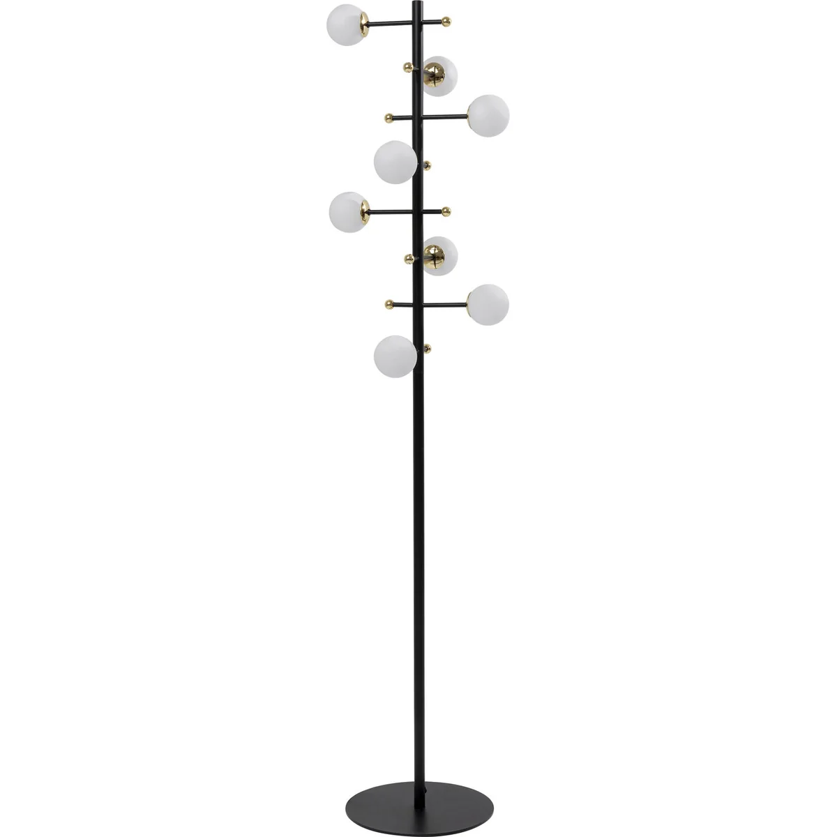 - A black designer lamp, almost as tall as a person, with eight milky-white spherical shades that radiate indirect light. The little golden decorative globes are brilliant - A floor lamp like an artistic object with a stable black steel base - A showpiece for the office, waiting room or the entrance area at home - Ingenious as a lighting solution next to sofas and sideboards in the living room and for upgrading the corners of rooms - Lighting designers recommend three to five light sources in a room. One of them should diffuse indirect light - like this timelessly beautiful floor lamp