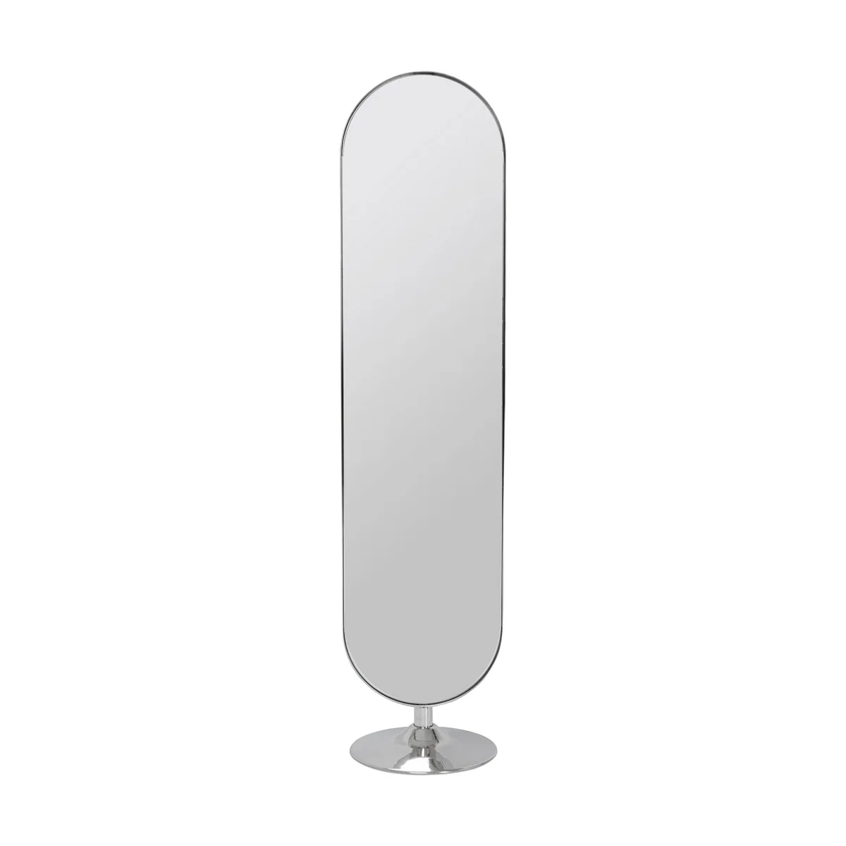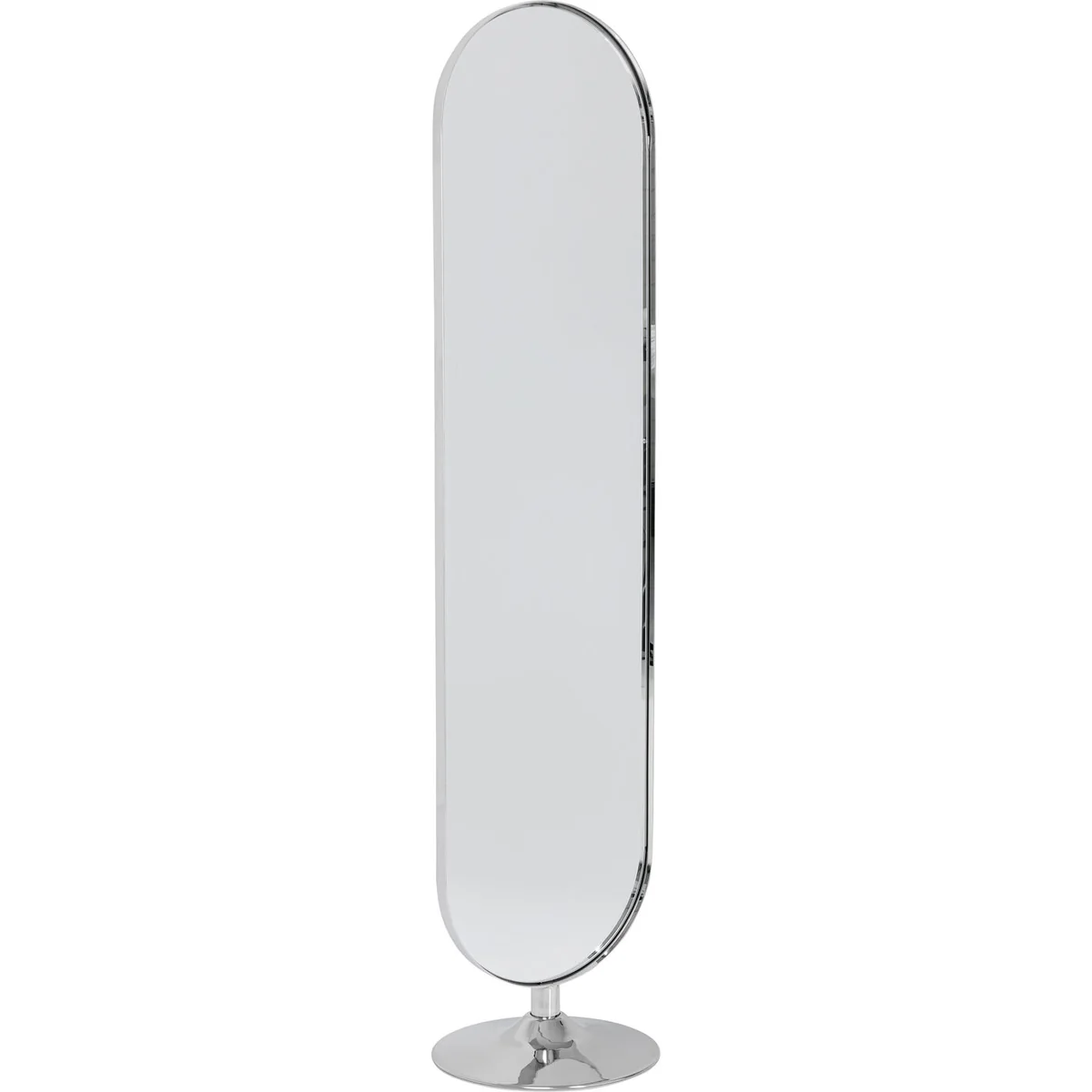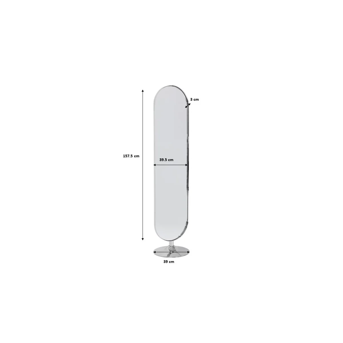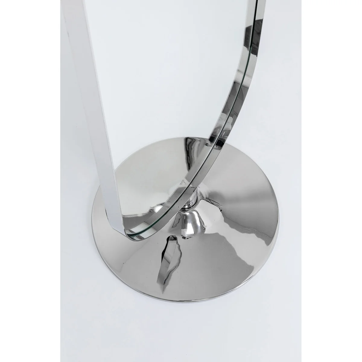 ● Large oval standing mirror with a round base. The polished steel of the frame and stand ensures cool glamour ● The mirror is perfect for an outfit check in the bedroom - thanks to its slim shape it also fits into the corner next to the wardrobe ● Heavy enough to demonstrate stability, light enough to change places in the home ● This is how a hall mirror becomes a cloakroom: simply combine it with a wall coat rack and a velvety stool - job done! ● Order it, unpack it and set it up - this large mirror comes already assembled.