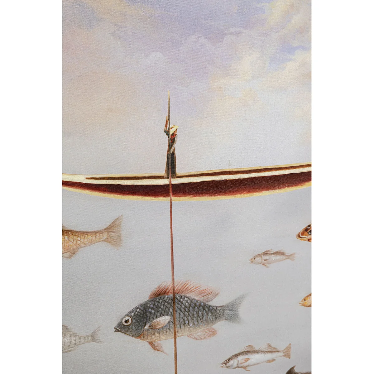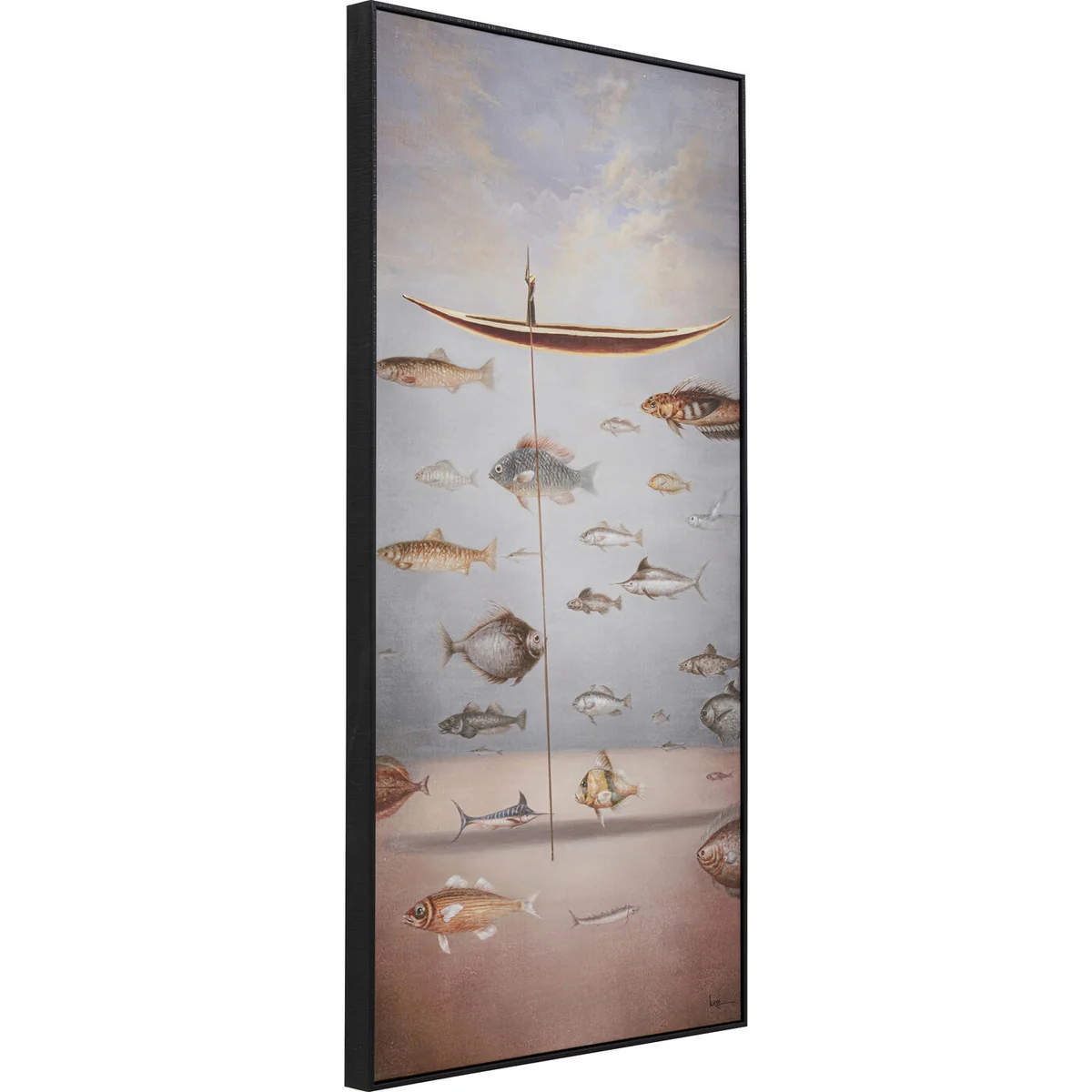 Immerse yourself in the world of surrealism with our fascinating picture. The image shows a boat floating majestically in the clouds and lots of ocean dwellers of very different species. The combination of reality and fantasy creates a unique atmosphere that encourages you to dream and relax. The soft colours and the masterful depiction of the fish in the picture make this wall decoration an eye-catcher in any room. This work of art for your home can be classified as surrealism, an art movement that alters reality to explore dream states, fantasy and the unconscious.