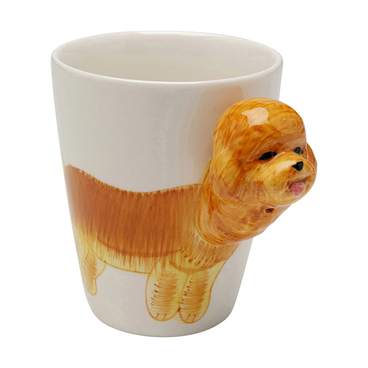 The mug is made from high-quality, glazed porcelain and measures 11 x 9 x 14 cm. It features a unique handle in the likeness of a poodle, making it a real conversation starter. The vibrant mix of white and orange colors adds a lively touch to its design.