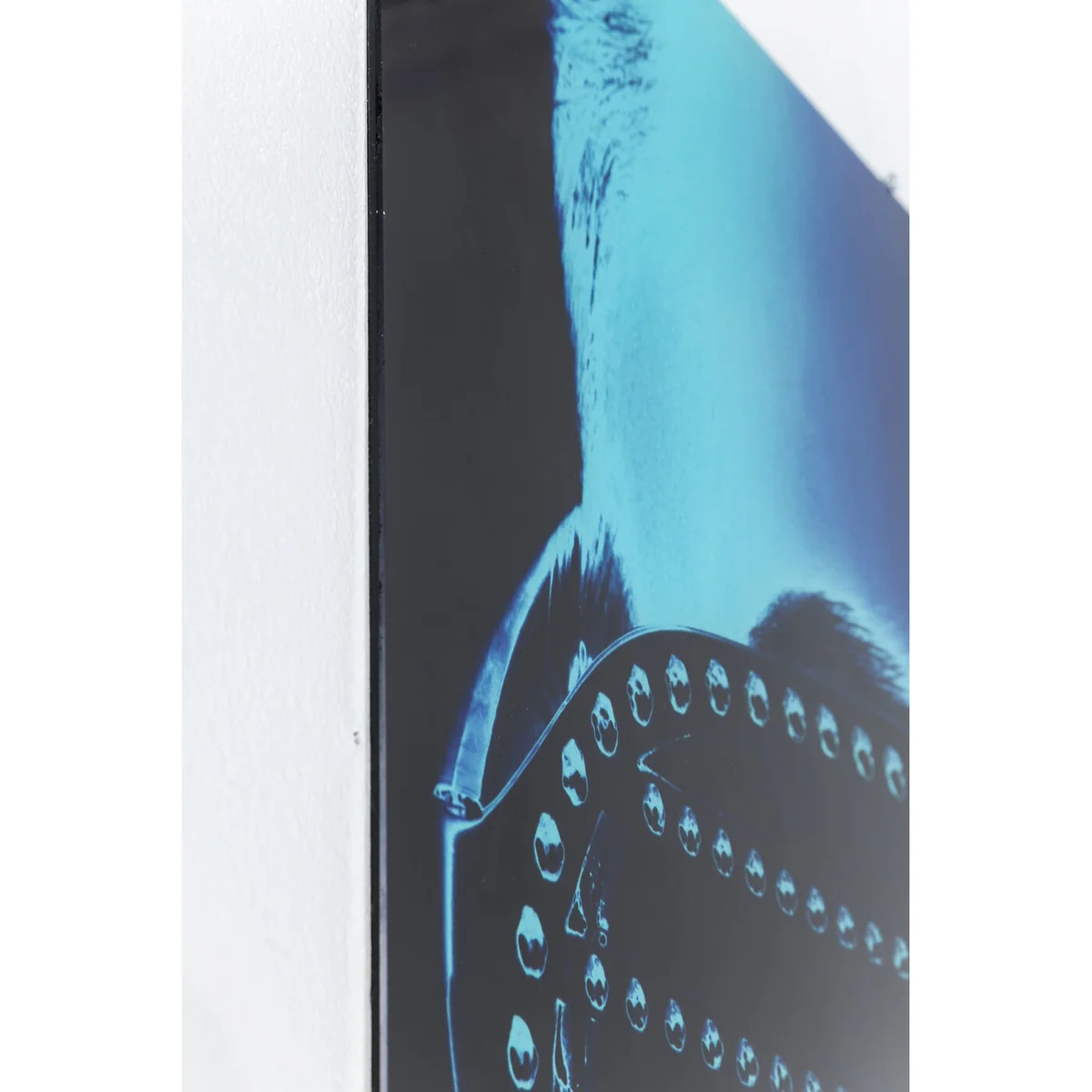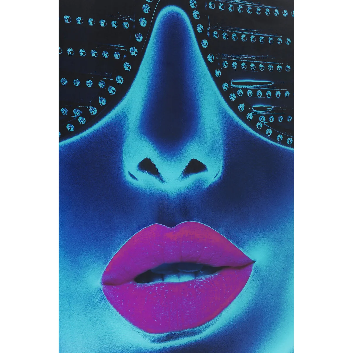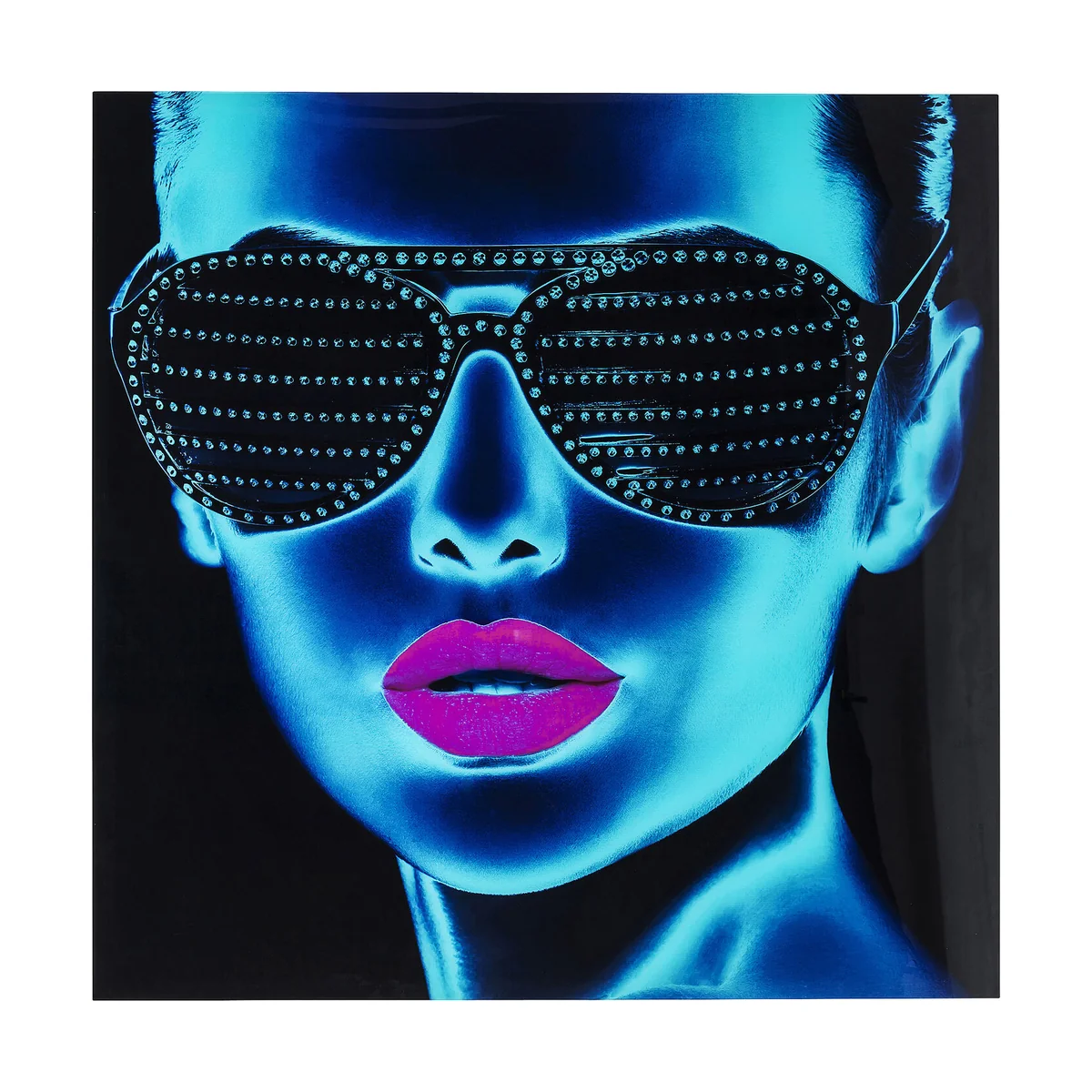 Glass picture with extraordinary charisma - not only for the living room. It shows the head of a woman with decorated sunglasses, looking directly at the viewer. The pink mouth is a strong contrast.