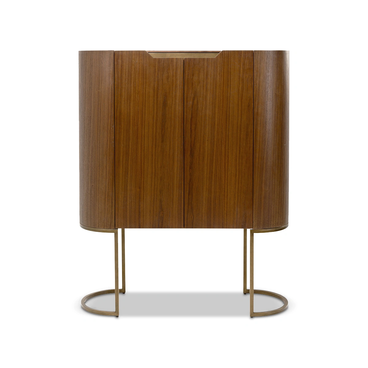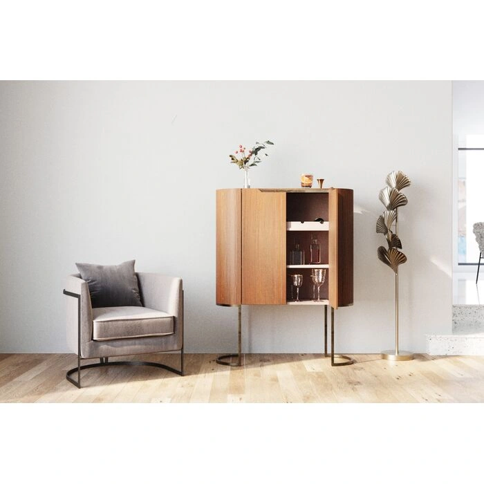 The furniture from the “Giorgio” collection skillfully combines sophisticated design and cozy elegance. Expressive wood meets elegant glass accents, lending depth and a touch of glamour to the overall look. Rounded lines and delicate metal feet create a modern lightness that still radiates down-to-earthness. This bar cabinet is a stylish eye-catcher – perfect for elegantly displaying glasses, bottles, and bar accessories while discreetly storing them at the same time. Inside, it surprises with its well-thought-out layout and clever details that make mixing and serving a real experience. Inside, the collection scores with plenty of space for your favorite items and everyday helpers – outside with a look that leaves a lasting impression. Ideal for stylish living concepts that value character, comfort