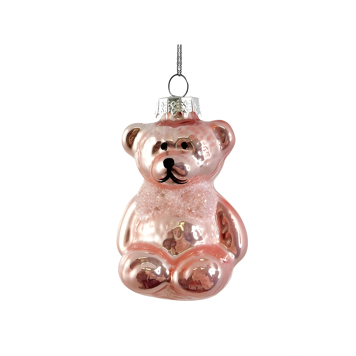 Introducing the Small Pink Glass Bear Ornament - a delightful addition to any festive decor. This heartwarming piece adds a soft glow to your setup, making it a perfect accent for pastel or romantic themes.