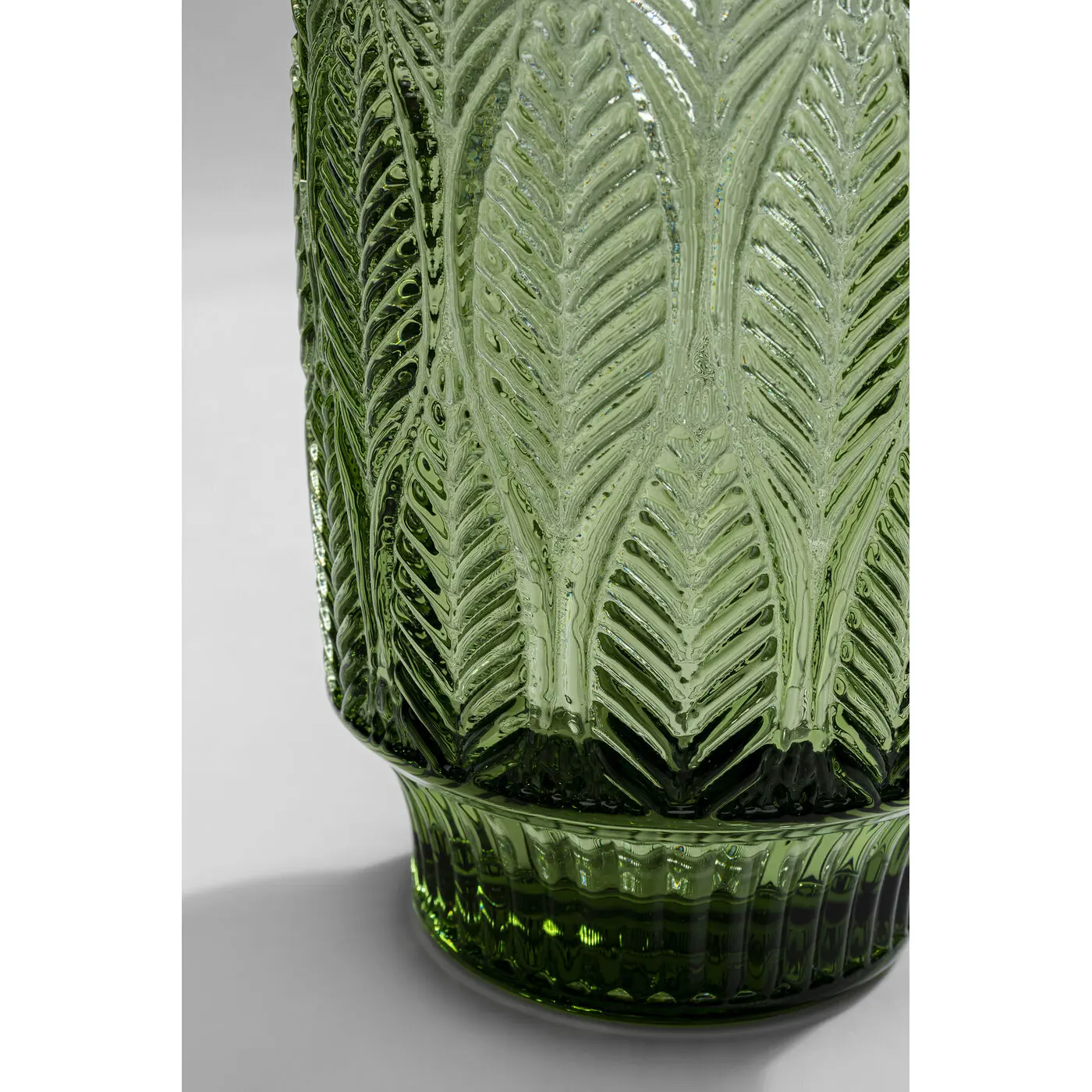 Key features include its classic shape, enhanced by a lively leaf pattern embossing, and its slightly transparent natural green color. The glass measures 14 x 8.1 x 8.1 centimeters and boasts a capacity of 450 ml, making it perfect for savoring refreshing drinks or generous servings of water.