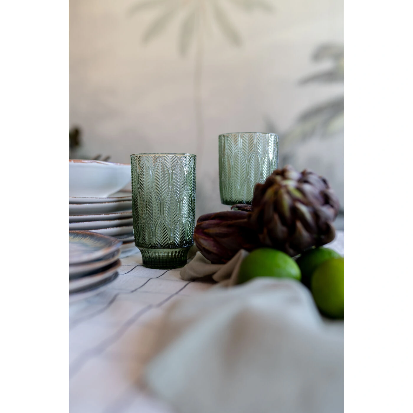 Introducing the Fogli Glass Drinking Glass in green colored glass, a timeless piece that infuses your interior with a touch of Mediterranean charm.