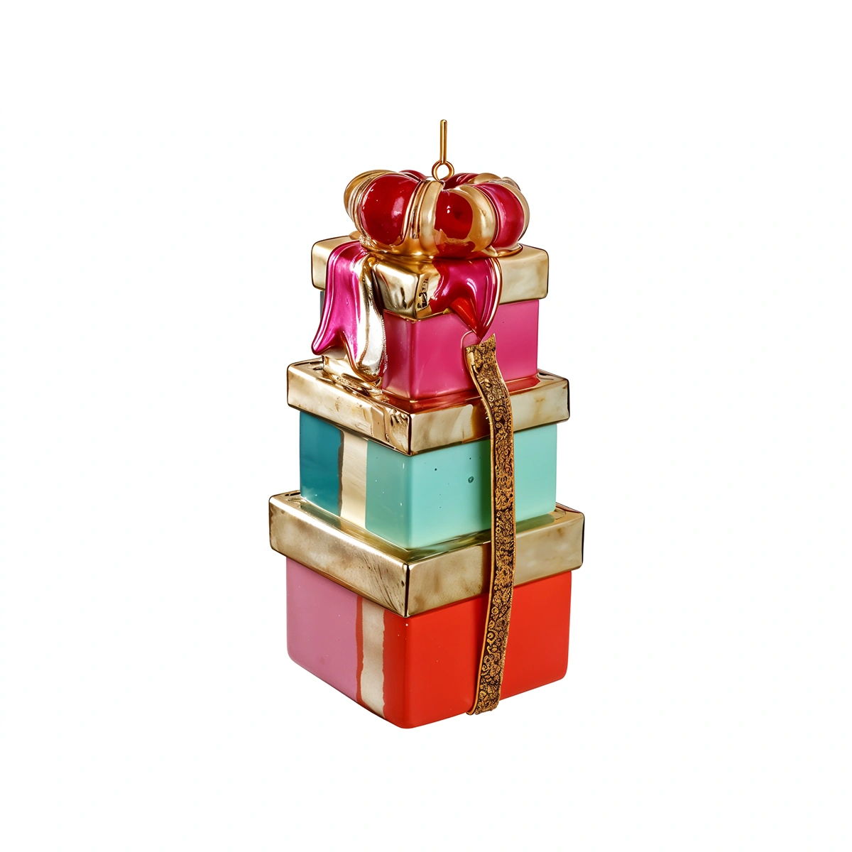 Add a touch of whimsy to your holiday decor with the Medium Multicolor Glass Gift Box Ornament.