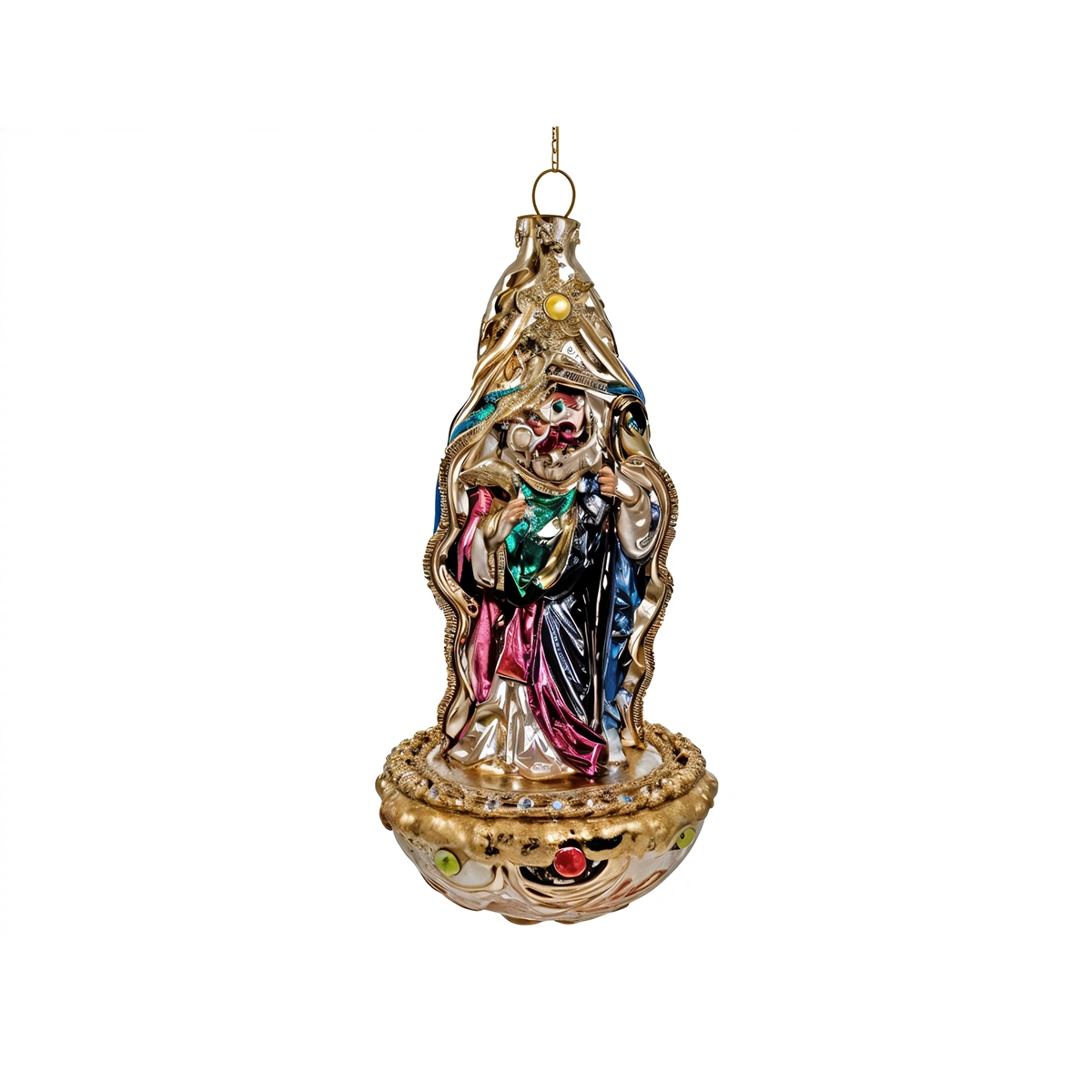 This ornament measures 14 cm and is made from high-quality, golden glass, featuring the Holy Family in a beautifully detailed design. It shines in the light, bringing a serene and festive ambiance to any room.