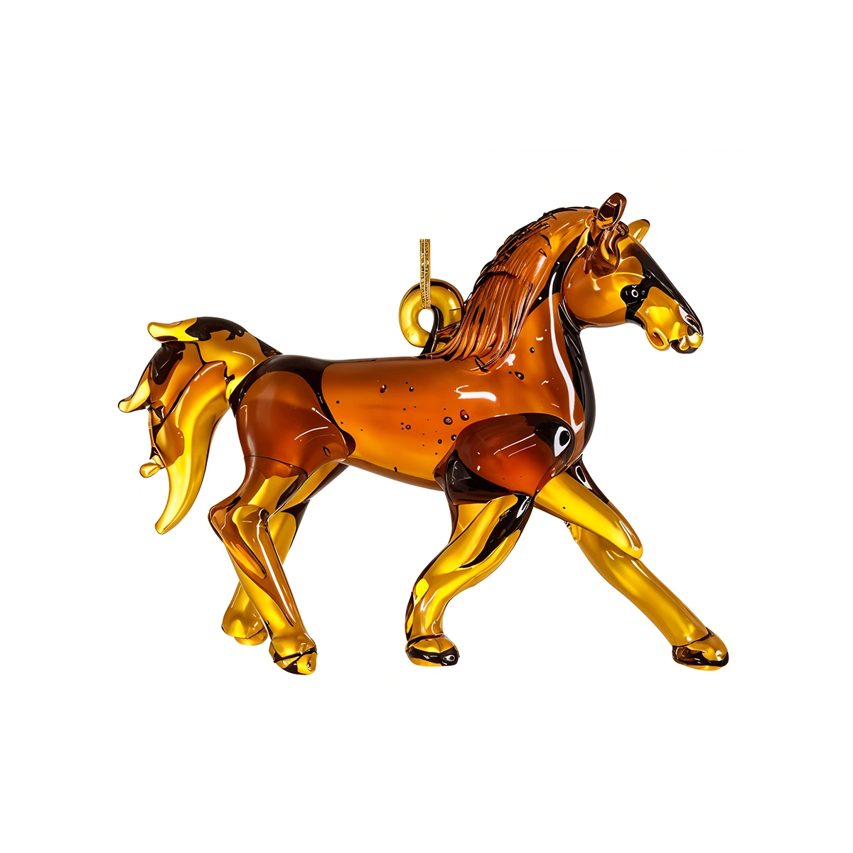 Key features of this horse ornament include its smooth form, warm brown color, and glass material. With a height of 9cm, it's small enough to fit comfortably on any tree or tabletop yet noticeable enough to make a statement.