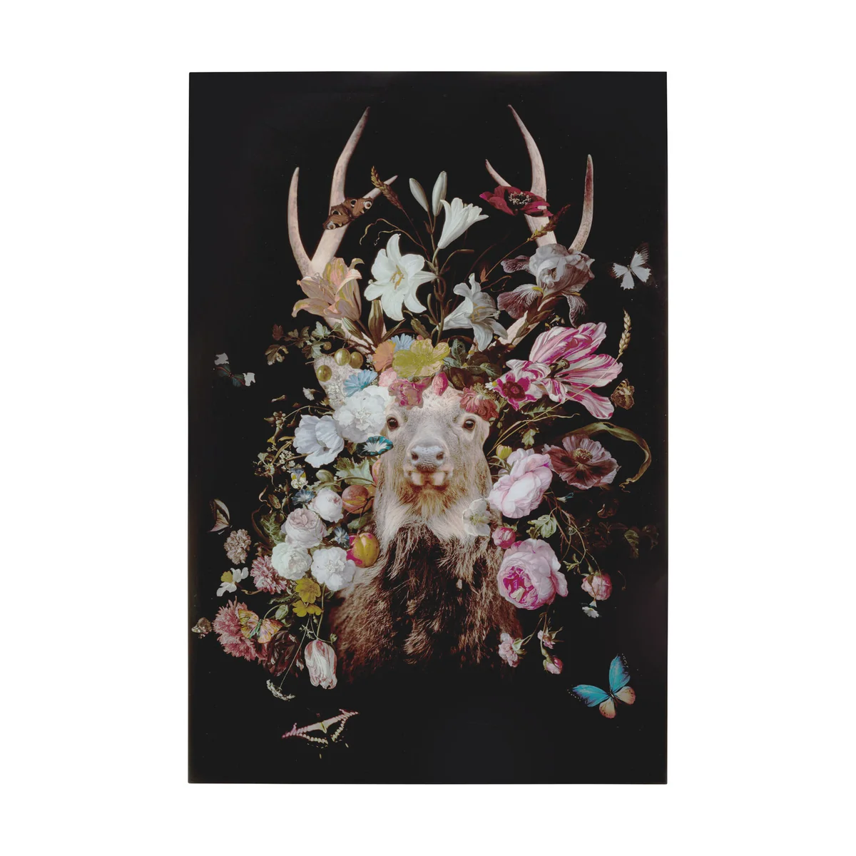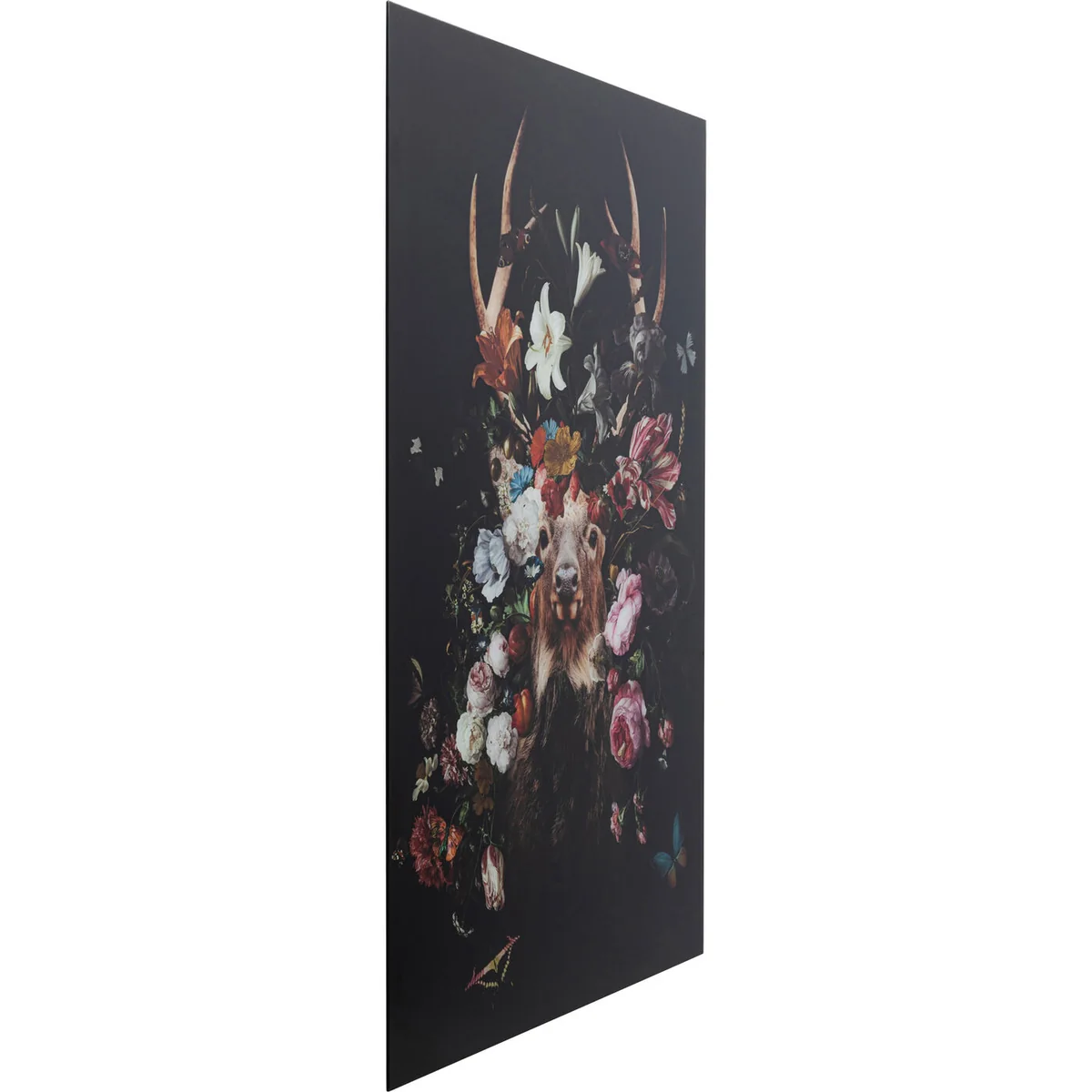 - A decorative picture for the wall in XL format sized 120x80cm - A colourful eye-catching design with deer, flowers and butterflies on a black background - Modern glass pictures can stand on their own or be a distinctive addition to the gallery wall - Easy to hang thanks to metal hooks on the back - Made of toughened safety glass
