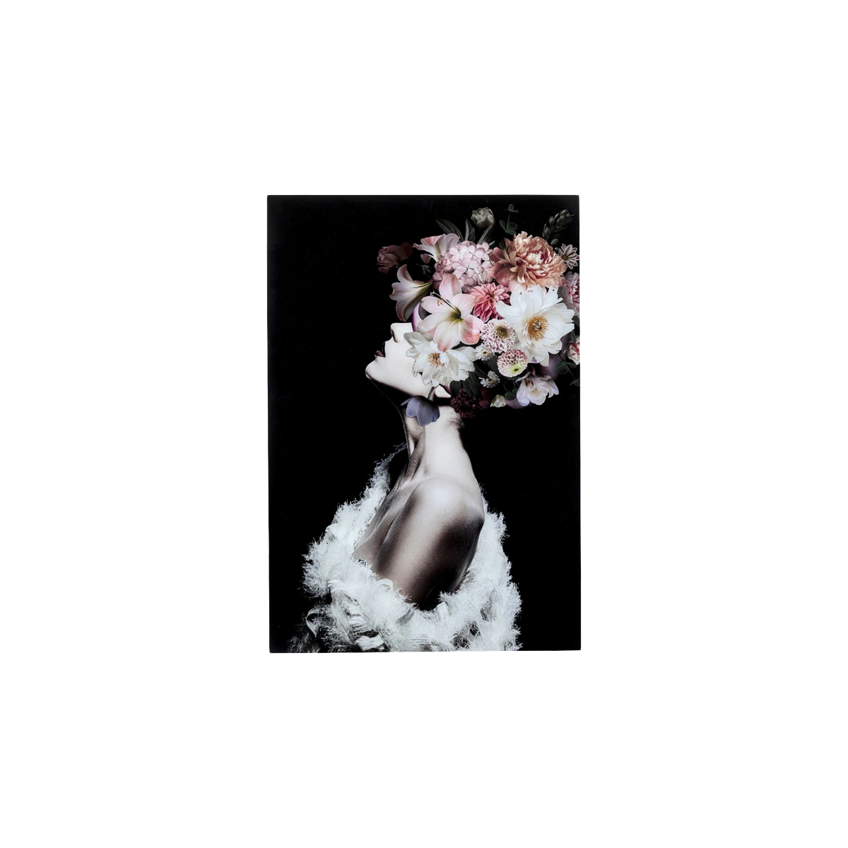 Beautiful as a flower goddess: the lady wears floral splendour as a hairstyle - our art photograph as a modern glass picture is an enrichment for every home art gallery. The picture in the large format of 80 x 120 cm makes a great central eye-catcher as well as part of a picture wall.