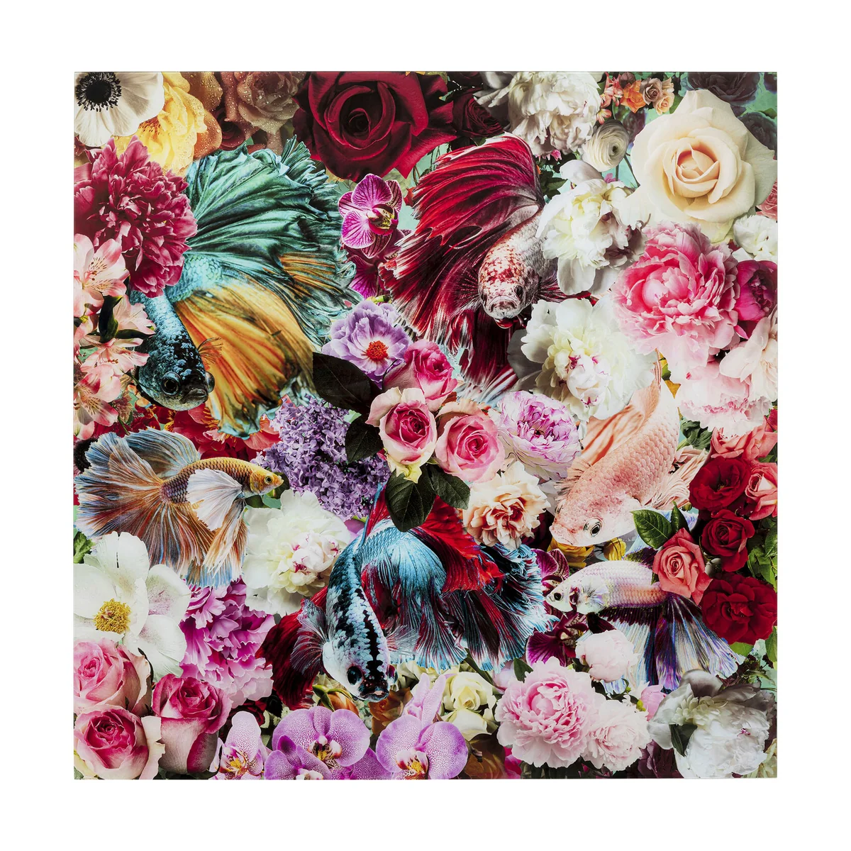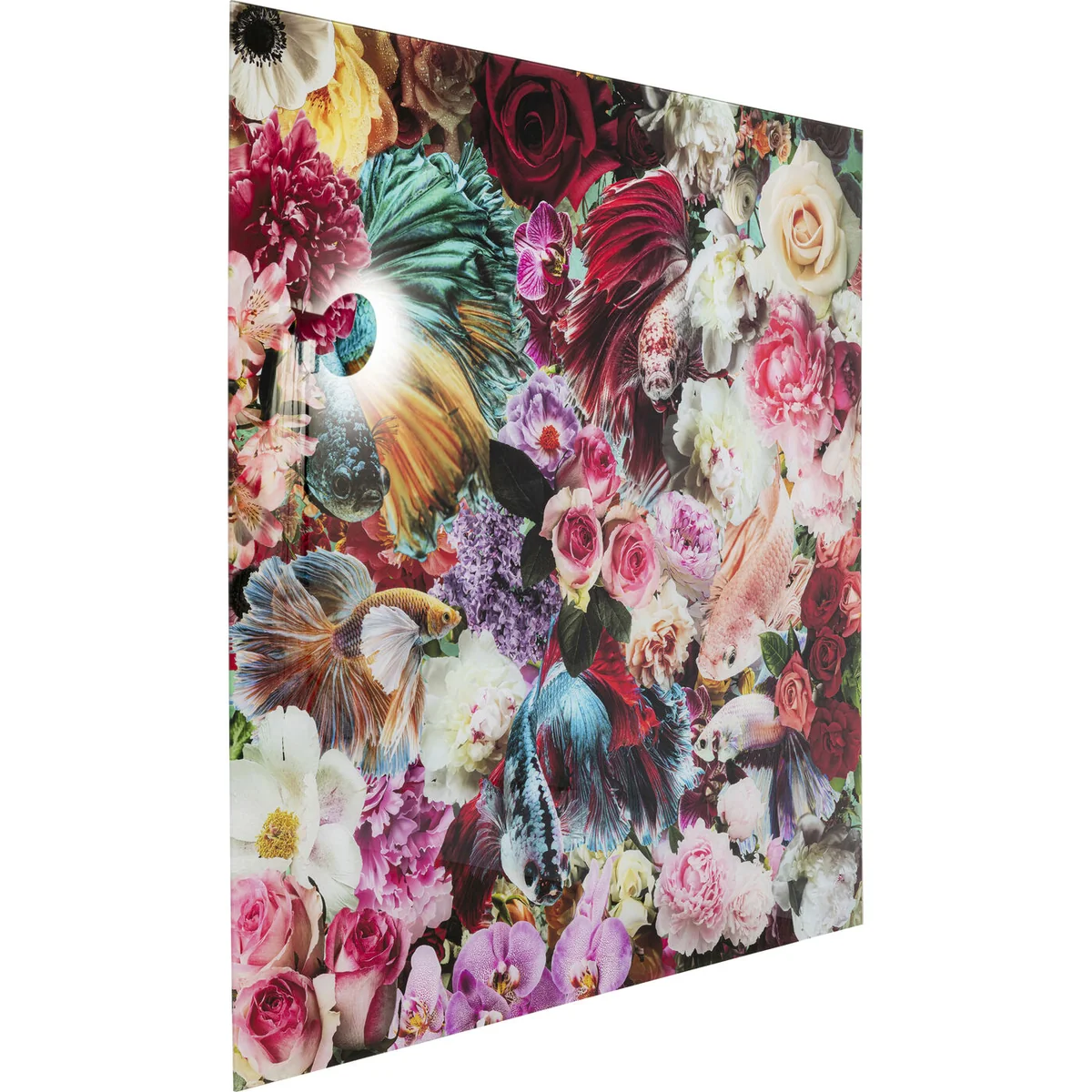 - Large, square glass picture sized 120x120x0.4 cm (H/W/D) - Colourful photo motif of fish and flowers - An original wall decoration for your living area - High-quality manufactured with ESG safety glass
