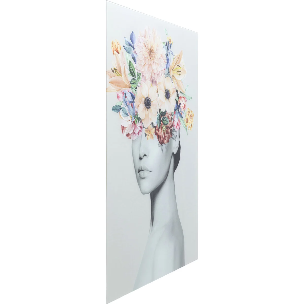 - Portrait of a beauty in black and white meets spring-coloured floral splendour - Frameless glass picture in portrait format: ideal as a central eye-catcher - Small effort - big effect, pictures instantly freshen up the look of an entire room - From Scandinavian to industrial to modern - wall pictures crown every furnishing style - Centrepiece for a picture wall with a range of floral motifs