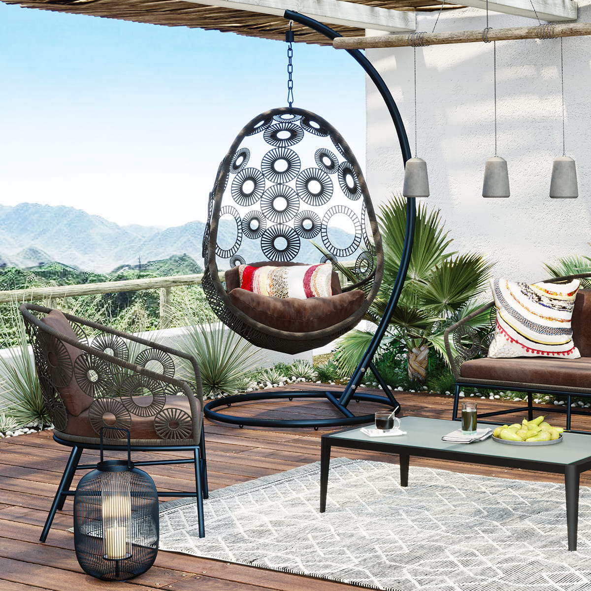 ● The woven body of poly rattan with a playful hole pattern also floats visually with lightness