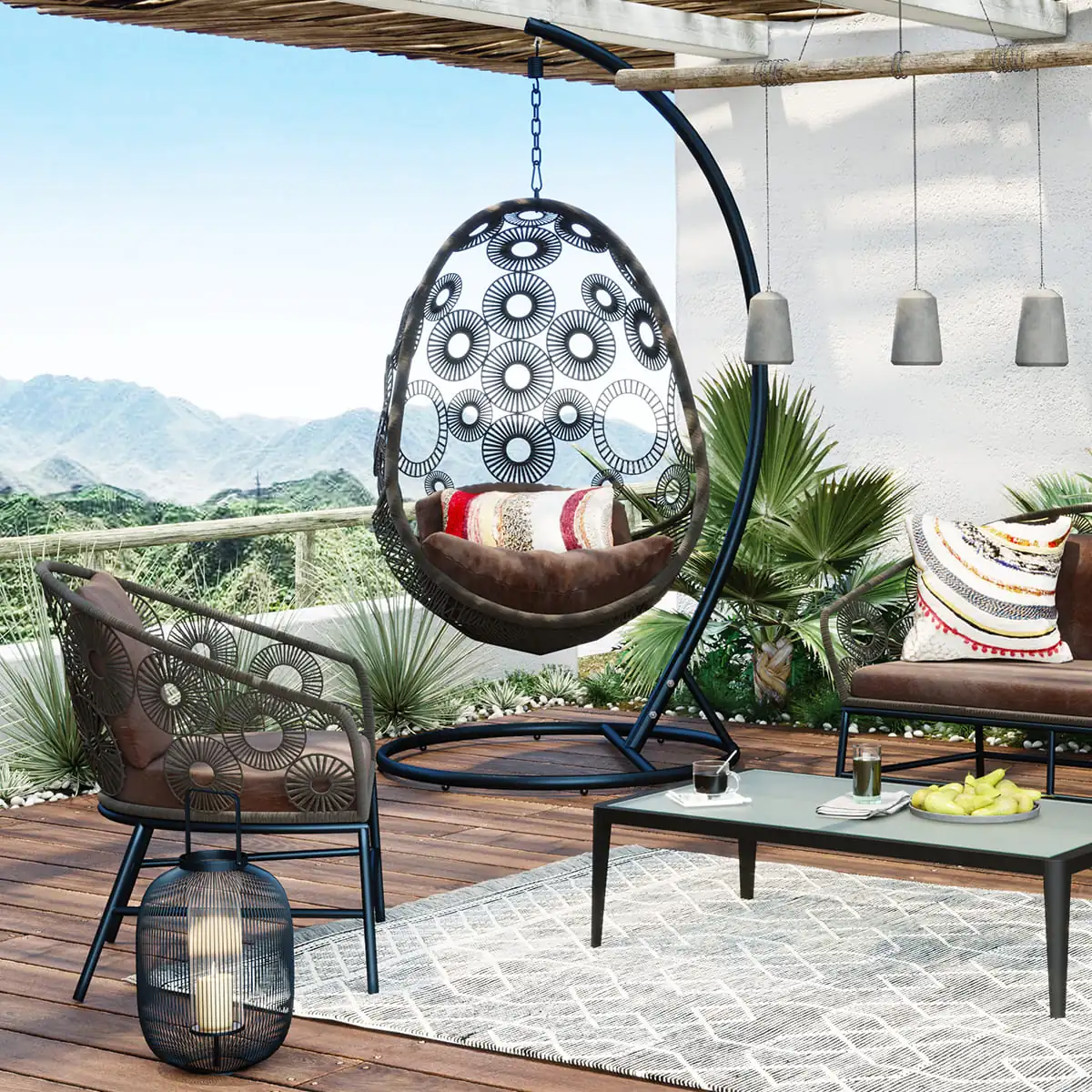 • The woven body of poly rattan with a playful hole pattern also floats visually with lightness