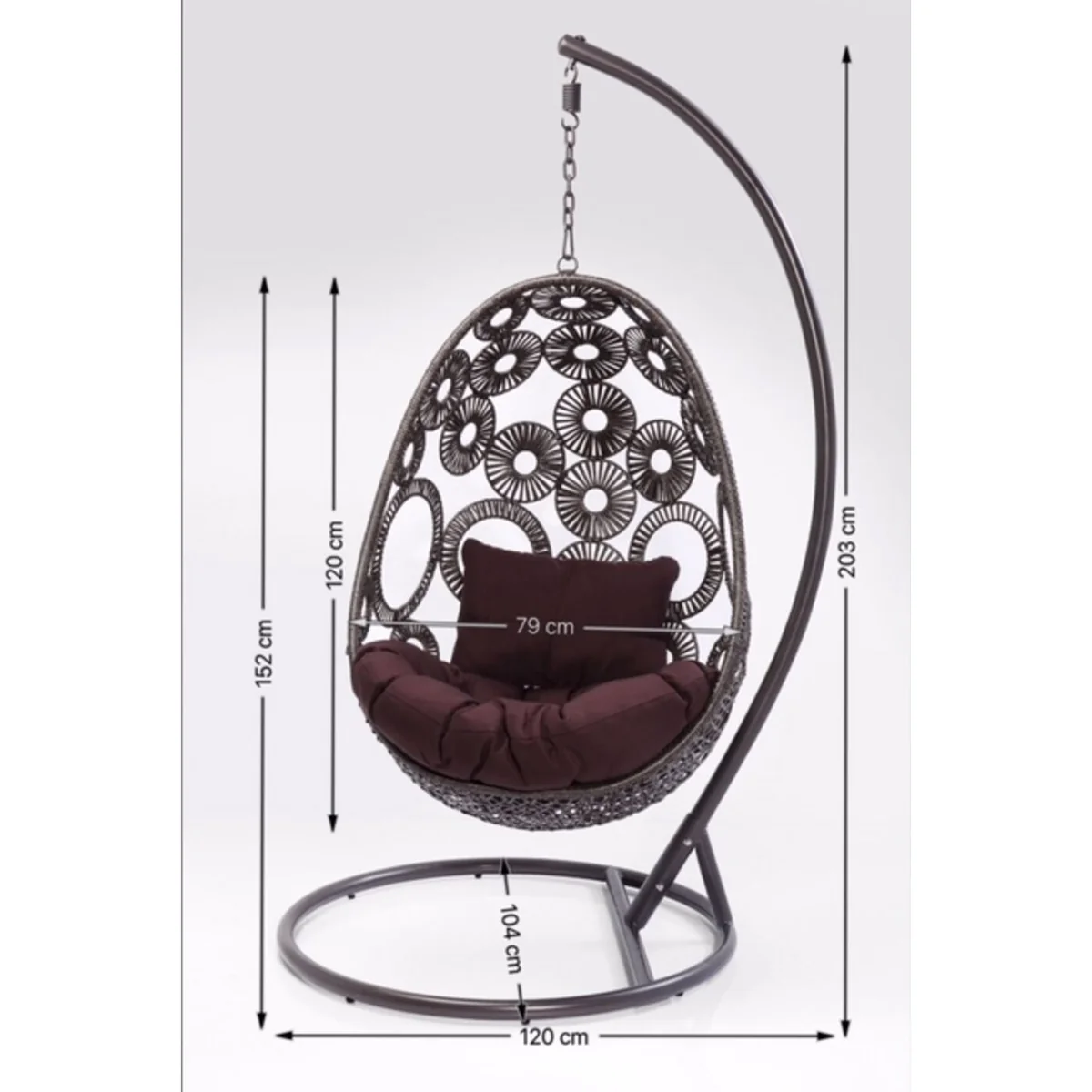 Key features include its large size of 120 cm length, 104 cm depth, and 209 cm height. The chair is crafted from brown, powder-coated steel that ensures durability and stability, offering a comfortable and secure swinging experience.