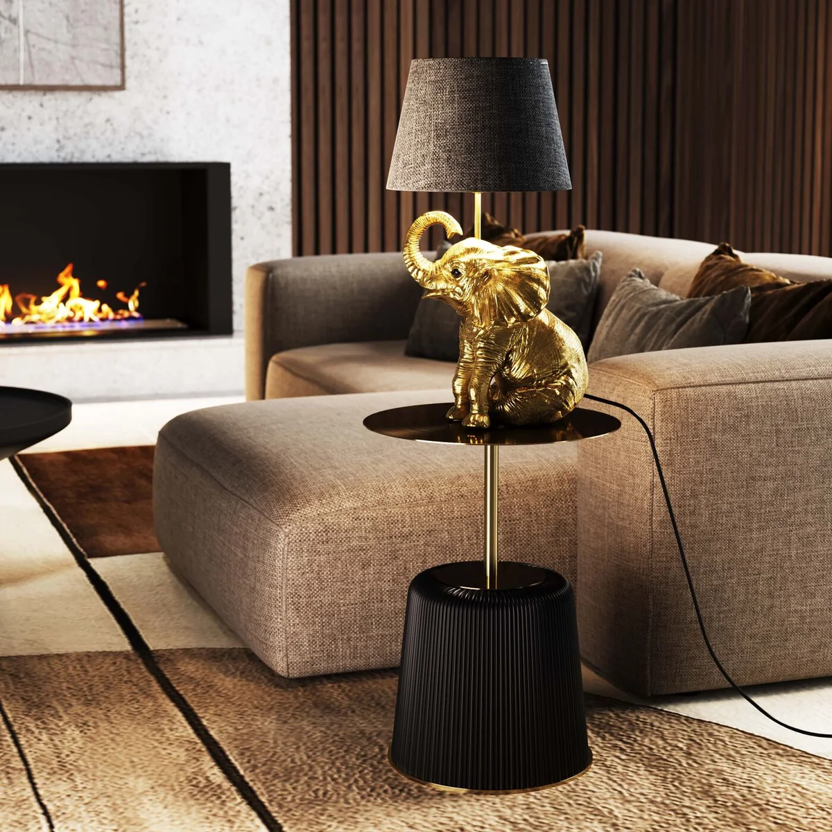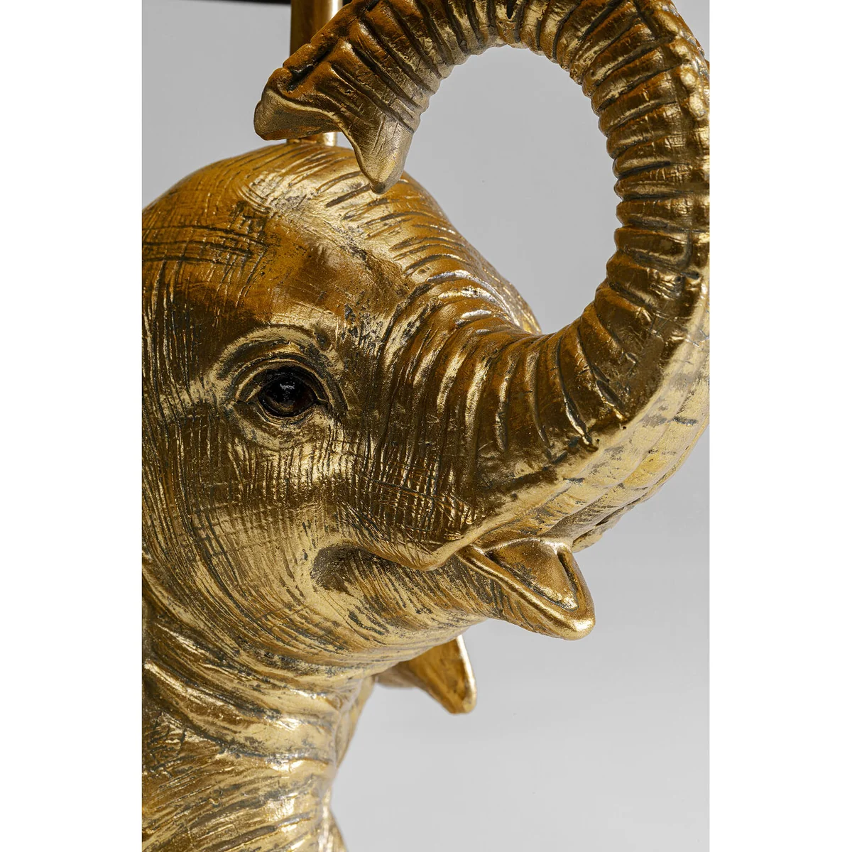 Key features of this lamp include a playful elephant figure in gold and black, measuring 48 x 27 x 27 centimeters. Crafted from durable polyresin with shiny button eyes and a mischievous smile, the lamp is highlighted by a golden inner shade that emits a warm, flattering light. The lamp is powered by a 230 V socket, compatible with E27 bulbs, and comes with a black textile-sheathed cable and toggle switch.