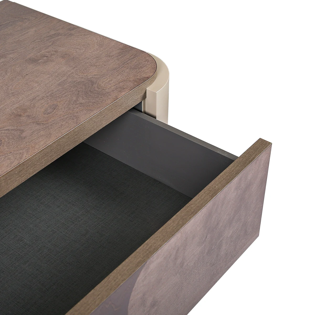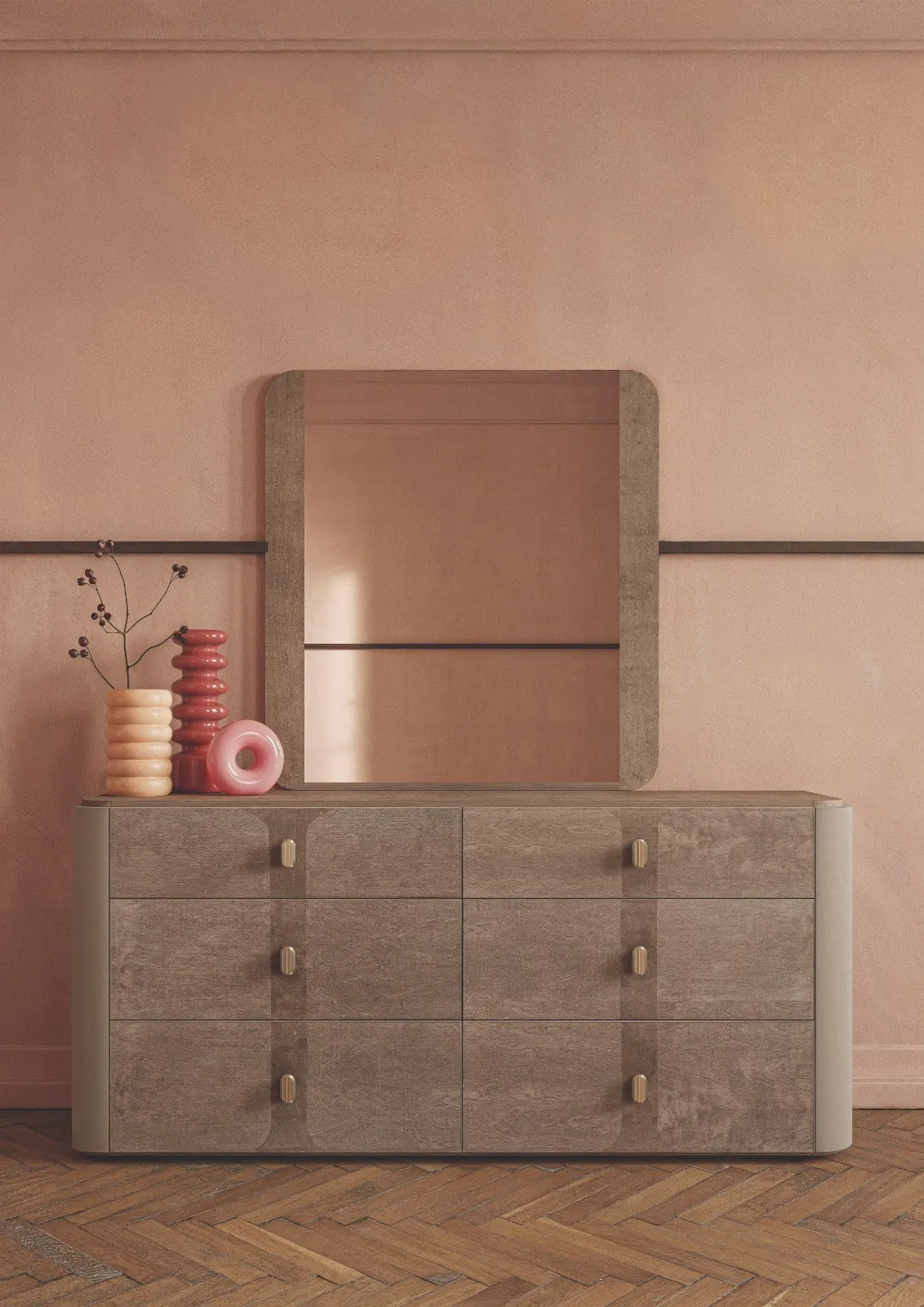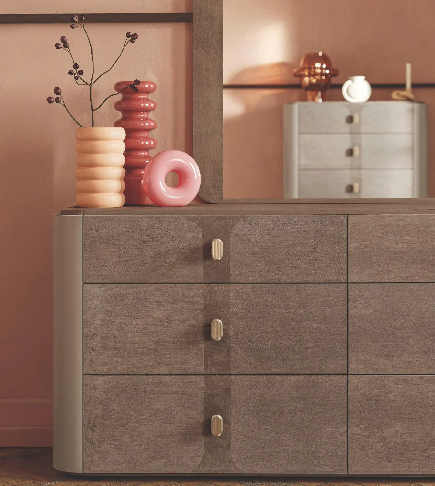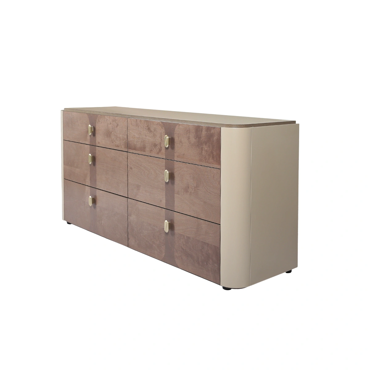 Melamine Saddle Birch Inlay Matt finish: used for inlaid fronts, covers (except the display cabinet), headboard and bed platform, table top, and extensions; Anthracite Alkorcell Paper: Utilized for the interiors of fronts, covers, headboard and bed platform, table top, and extensions; Cream Imitation Leather Melamine: Utilized in the divisions, shelves, side panels, display cabinet cover, bottoms, and back panels of the display cabinet