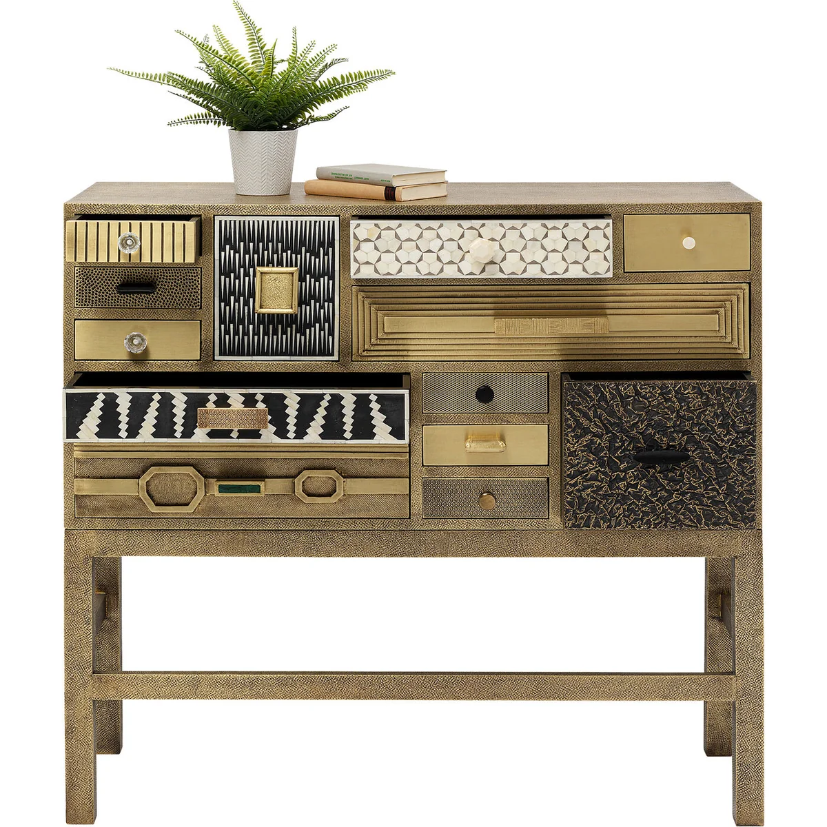Boasting a generous 13 drawers, this high dresser offers ample storage space while enhancing your room's aesthetics. The dimensions of L 110 cm, W 40 cm, and H 105 cm make it a perfect fit for most bedroom sizes, while the glass colored intarsia adds a touch of sophistication and finesse.