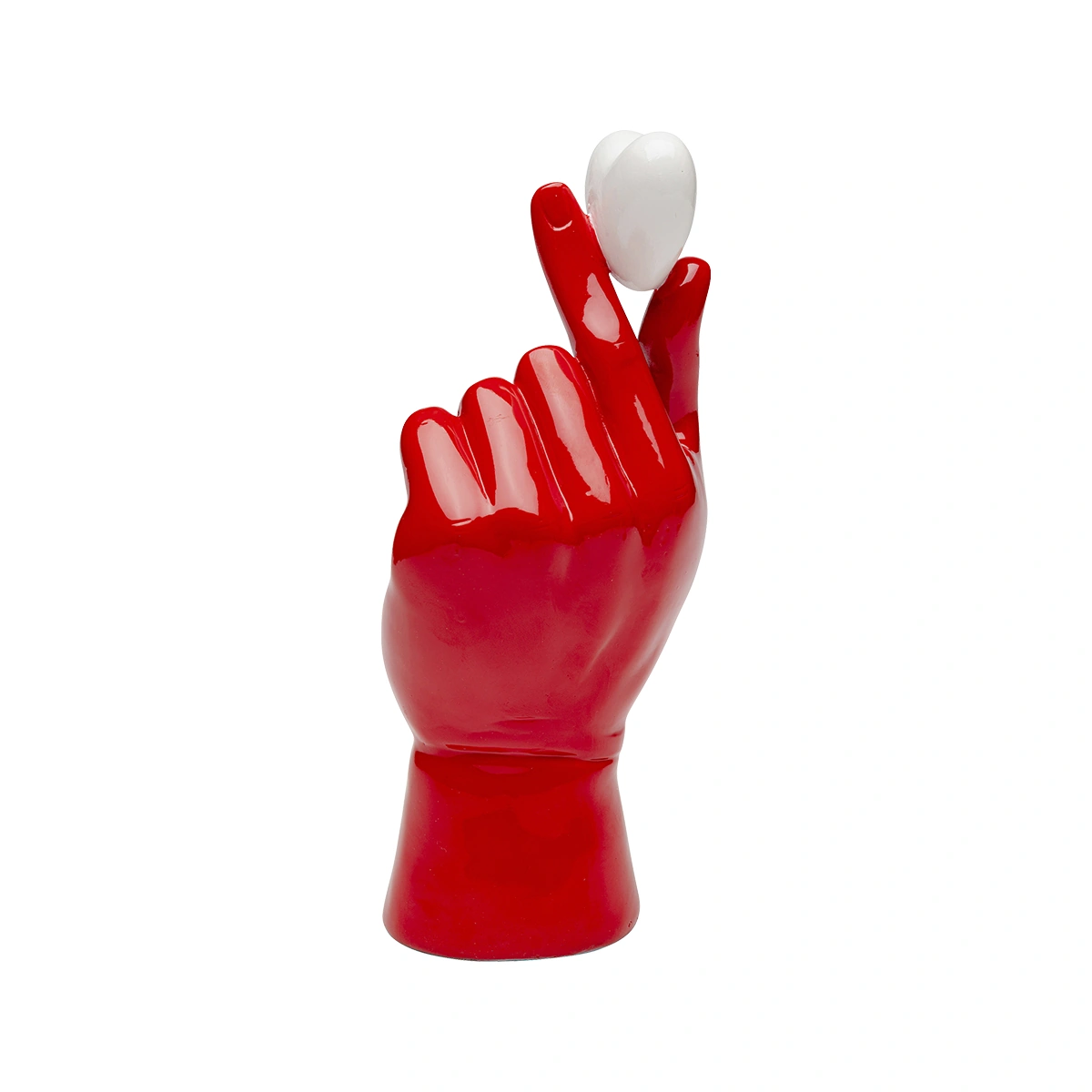 The decorative object measures 26 x 12 x 8.5 cm (H/W/D), perfectly sized to make its presence felt. The heart, held in a hand, is crafted from polyresin and painted in vibrant red and white shades. Its unique design and craftsmanship add a touch of exclusivity.