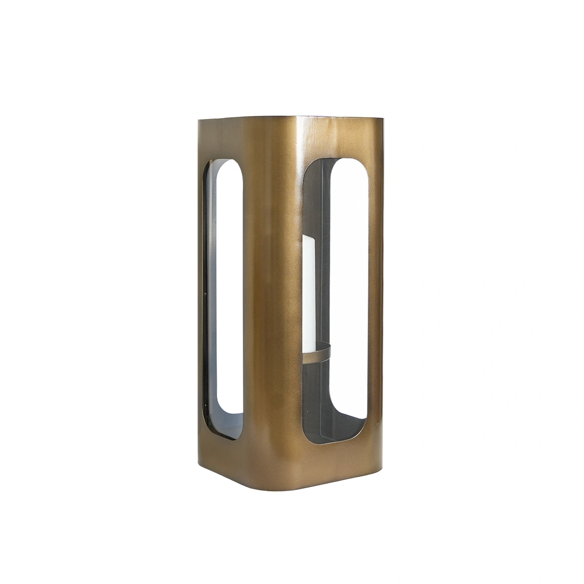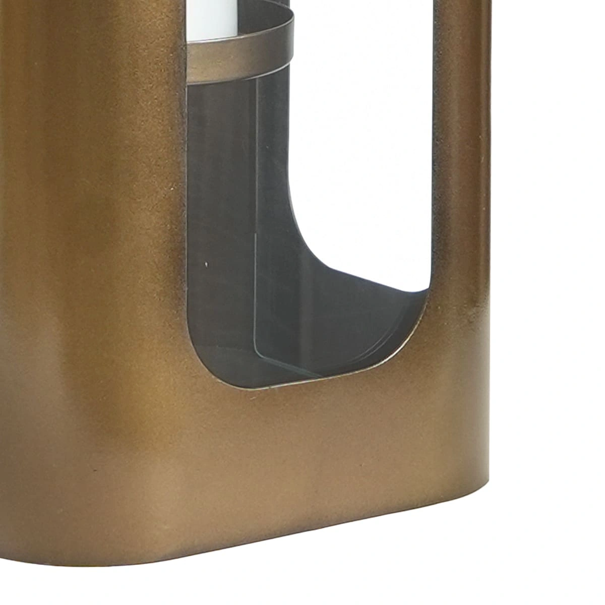 The Hoxton Floor Hurricane with Pillar Holder (Small) in Gold offers an elegant way to display candles, with clear glass sides that let the warm glow shine through. Its compact design makes it ideal for smaller spaces or as part of a decorative grouping.