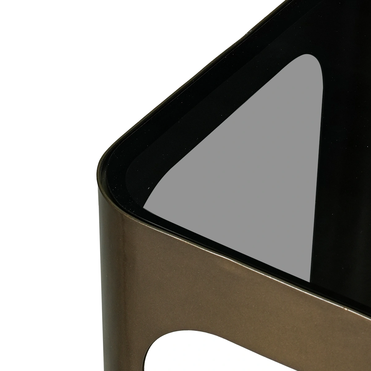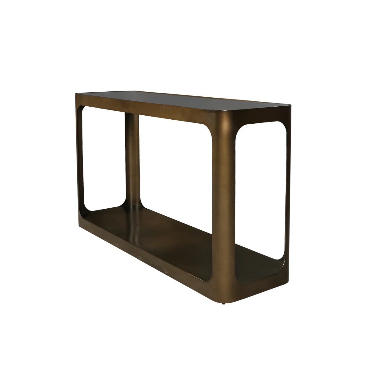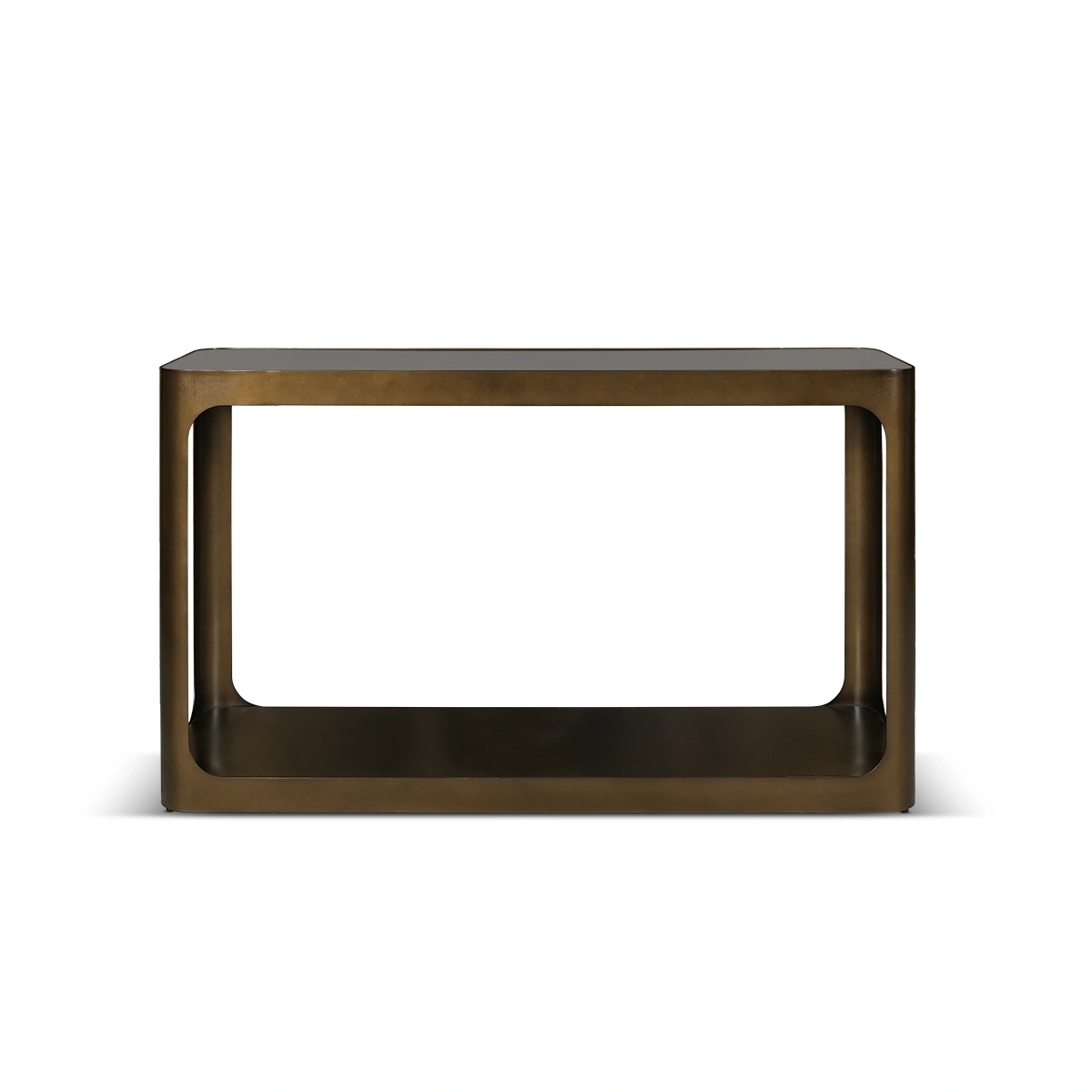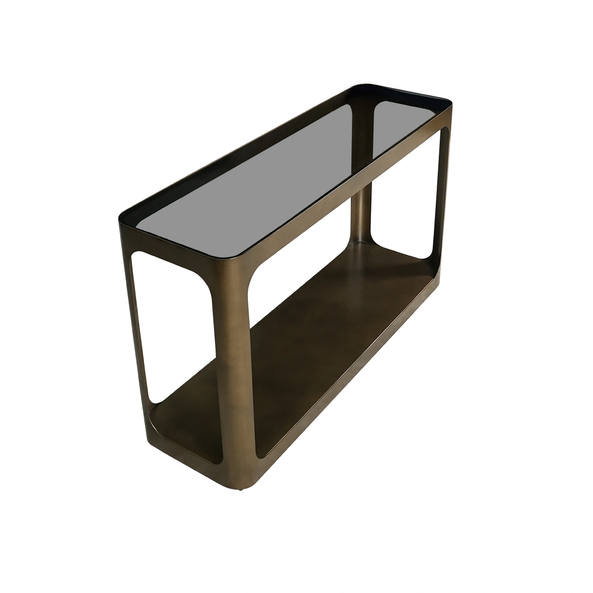 The Black Hoxton Glass Console Table in iron and glass is a modern masterpiece designed for slender spaces and transitional zones. Its smoke gold frame and black-tinted glass top lend an air of elegance and sophistication.