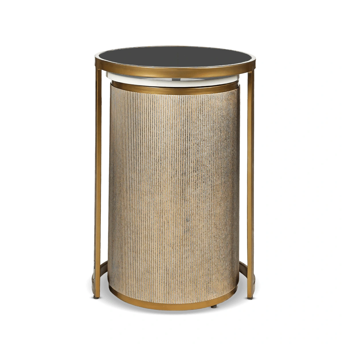 The Janus End Table Set brings together black-tinted glass, white marble shelving, and a satin brass frame with champagne gold accents. These nesting tables offer both beauty and function, perfect for layered styling in refined, contemporary spaces.