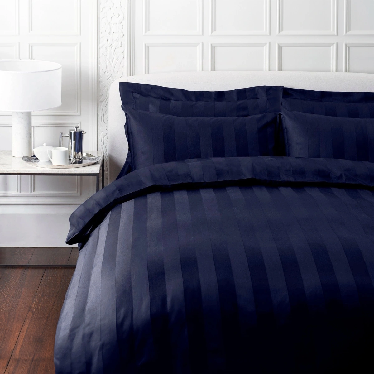 The 500 Thread Count Cotton Satin Stripe range is made of 100% combed cotton using the finest long-staple yarns, and is naturally hypoallergenic and suitable for year-round use. The fabric is woven on a dobby loom, and features small geometric patterns created by lifting the warp threads.