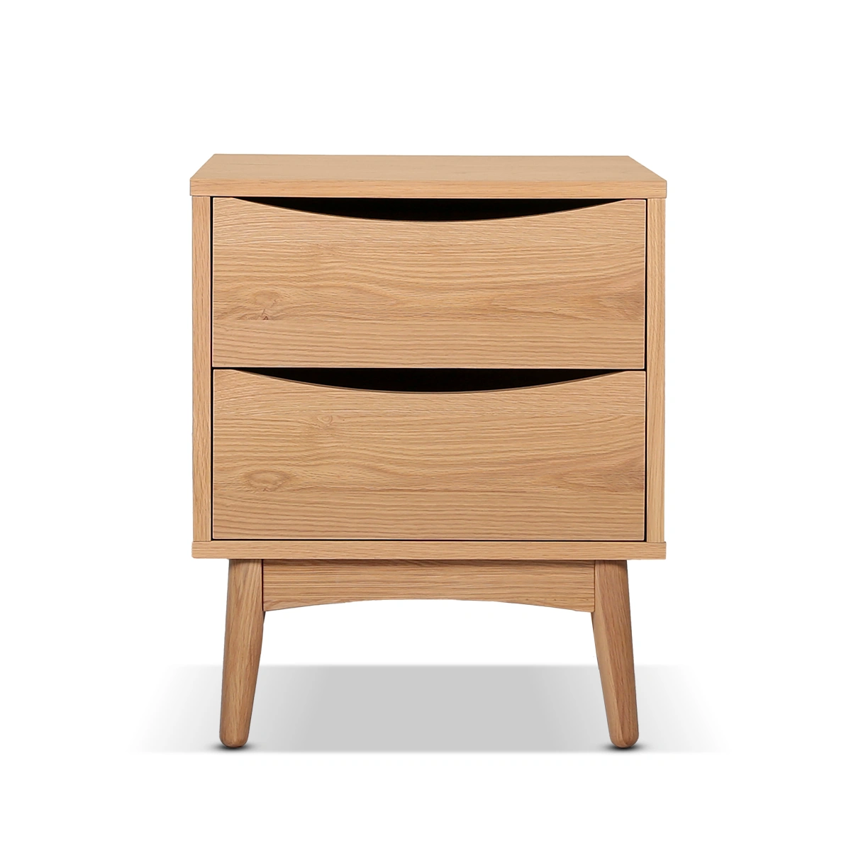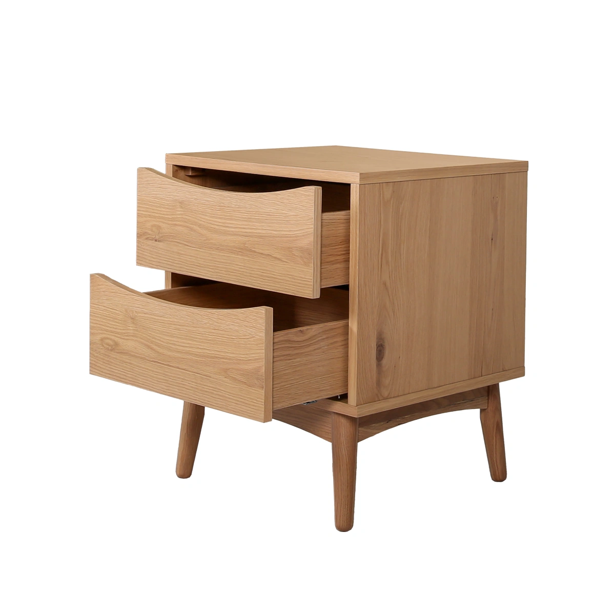 Key features of this nightstand include its compact size (L 50 cm | W 45 cm | H 60 cm), providing both surface space and discreet storage. With its smooth oak veneer top and sturdy solid oak legs, it's the perfect blend of function and style.