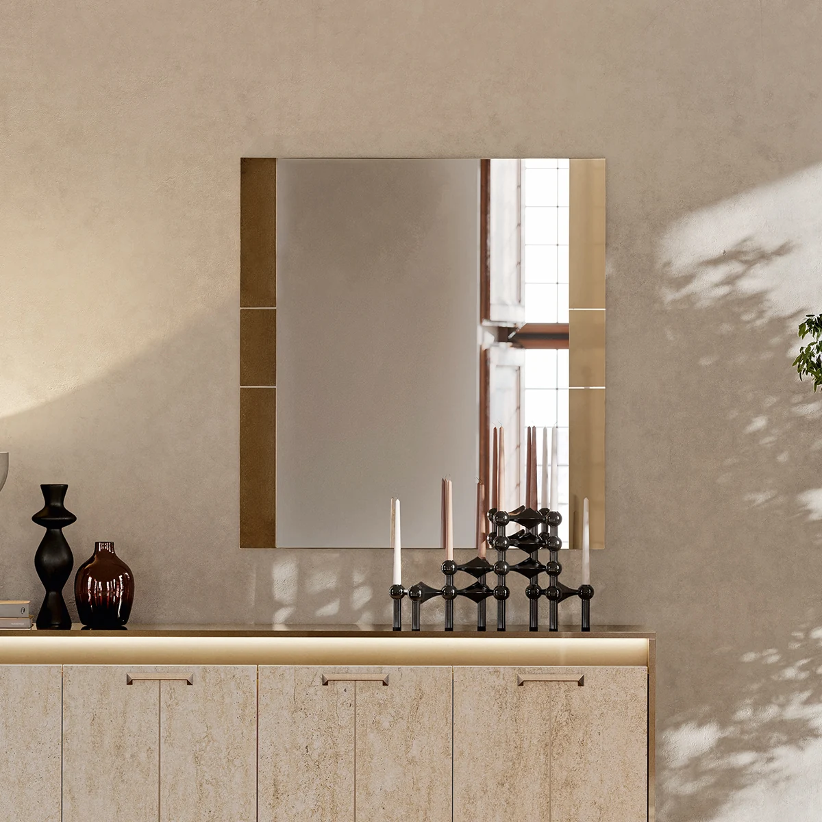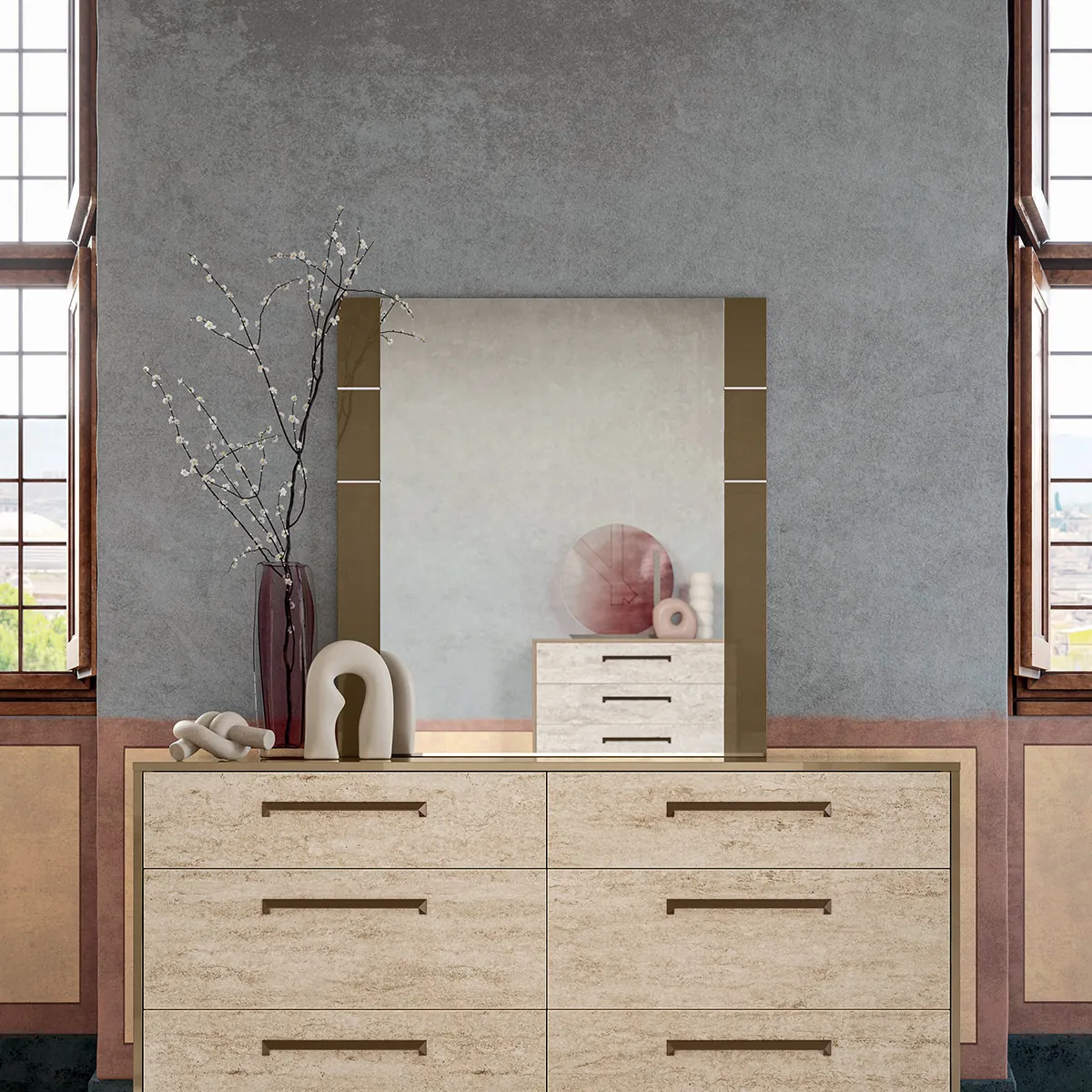 The Jo Mirror in Gold is a sleek decorative accent designed to enhance light and depth in modern interiors. Perfect for bedrooms or dressing areas, this wall mirror adds a refined touch while maintaining a clean, contemporary aesthetic. Featuring a melamine body with a high gloss Travertino eco stone finish paired with clear glass, the mirror offers durability and visual balance. Its proportions make it suitable for daily use while elevating surrounding décor. This mirror enhances brightness and creates a sense of spaciousness. Its elegant finish and sturdy construction make it a versatile piece that complements both modern and classic interiors.