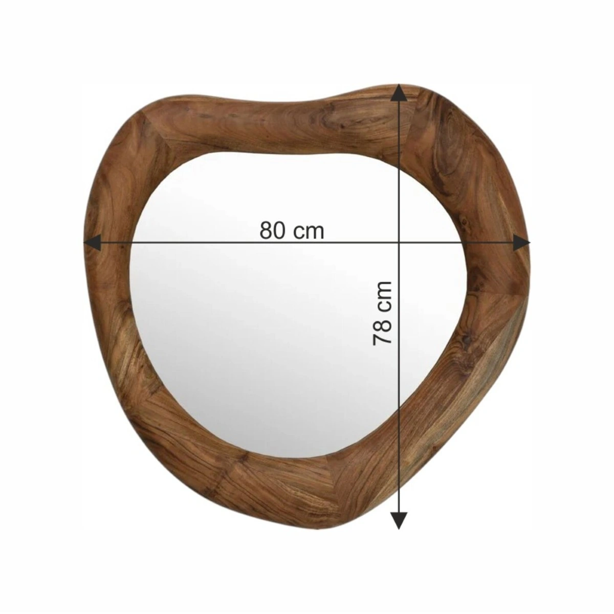 Key features include an abstract-shaped mirror with a lacquered solid acacia wood frame measuring 80 x 78 x 7 centimeters (H/W/D). The rounded frame's warm appearance and striking grain add a harmonious, natural aesthetic to any room. Suitable for both horizontal and vertical wall mounting, it's a versatile piece for any modern home.